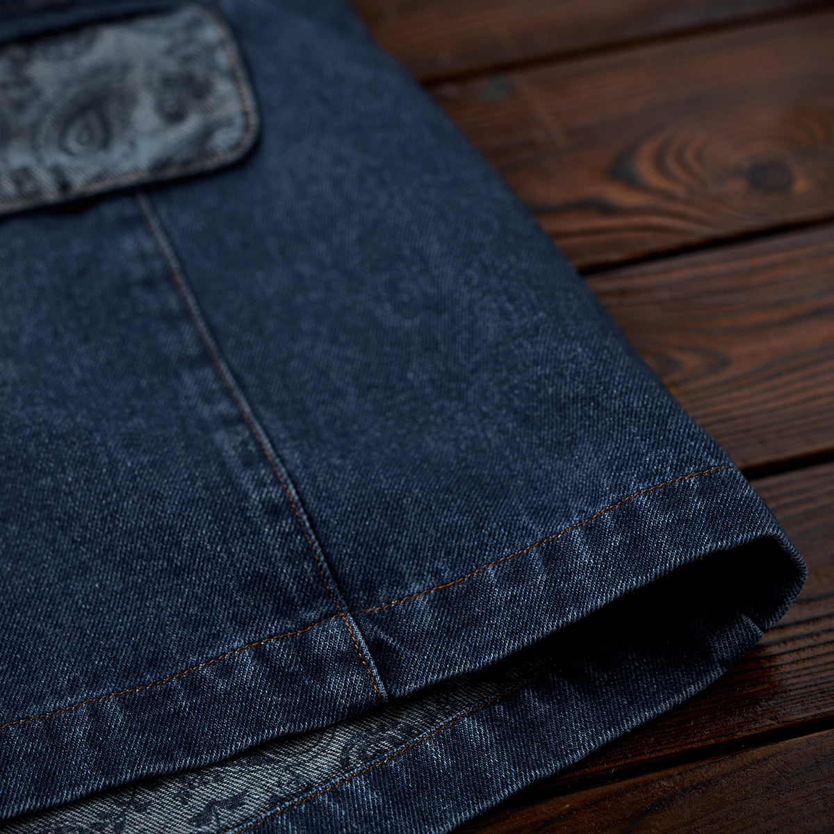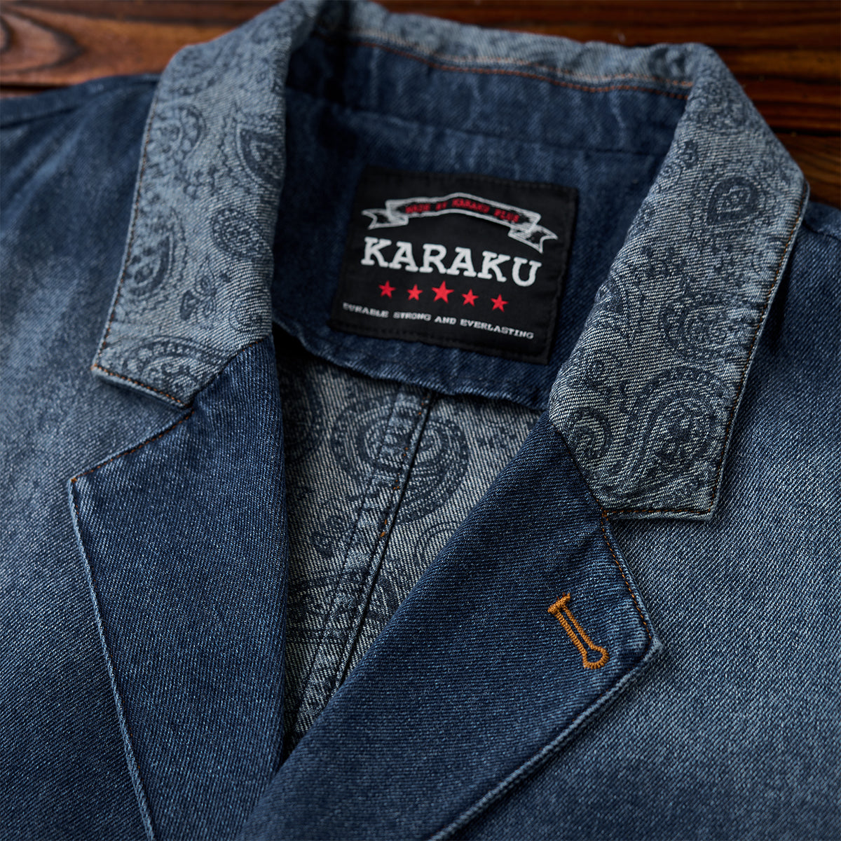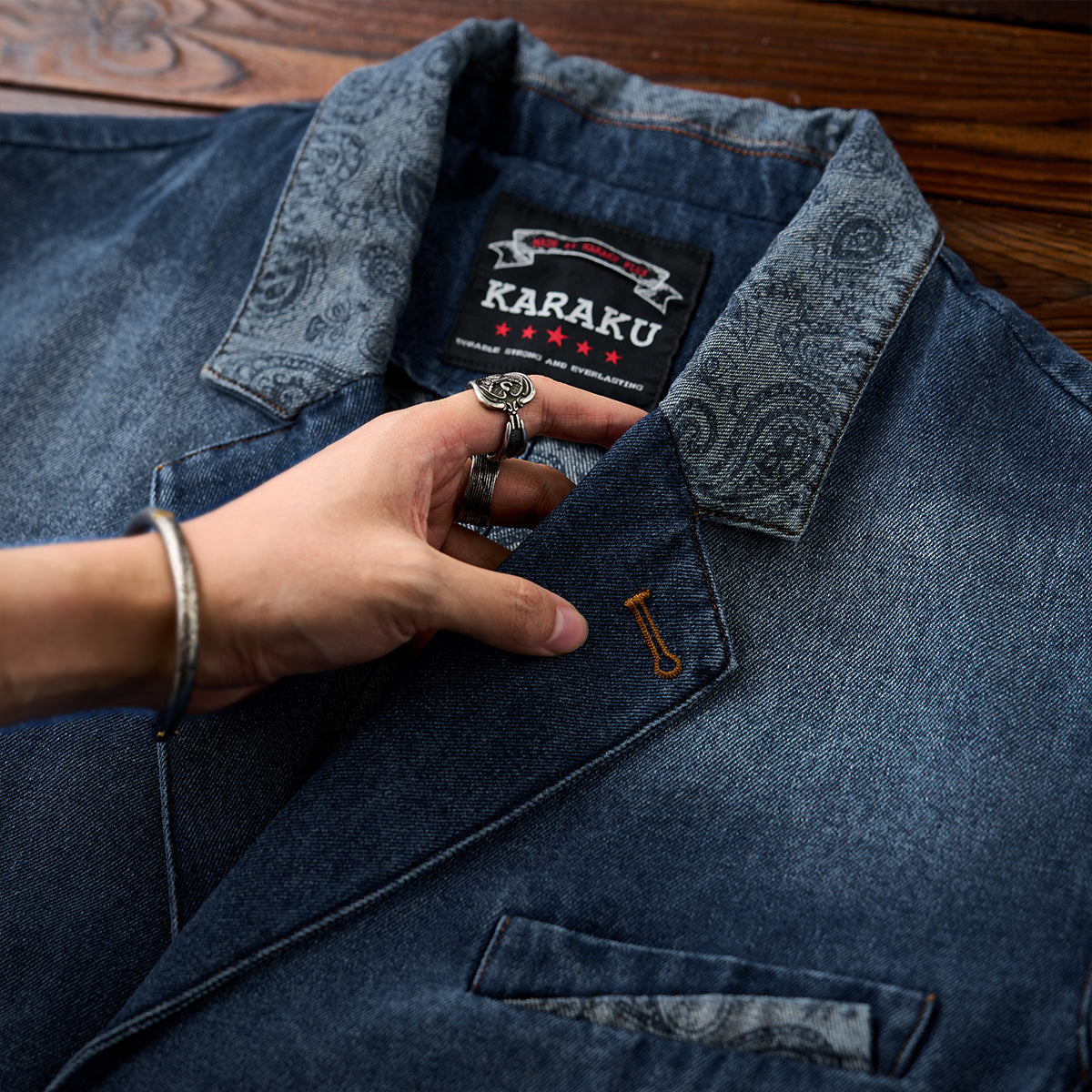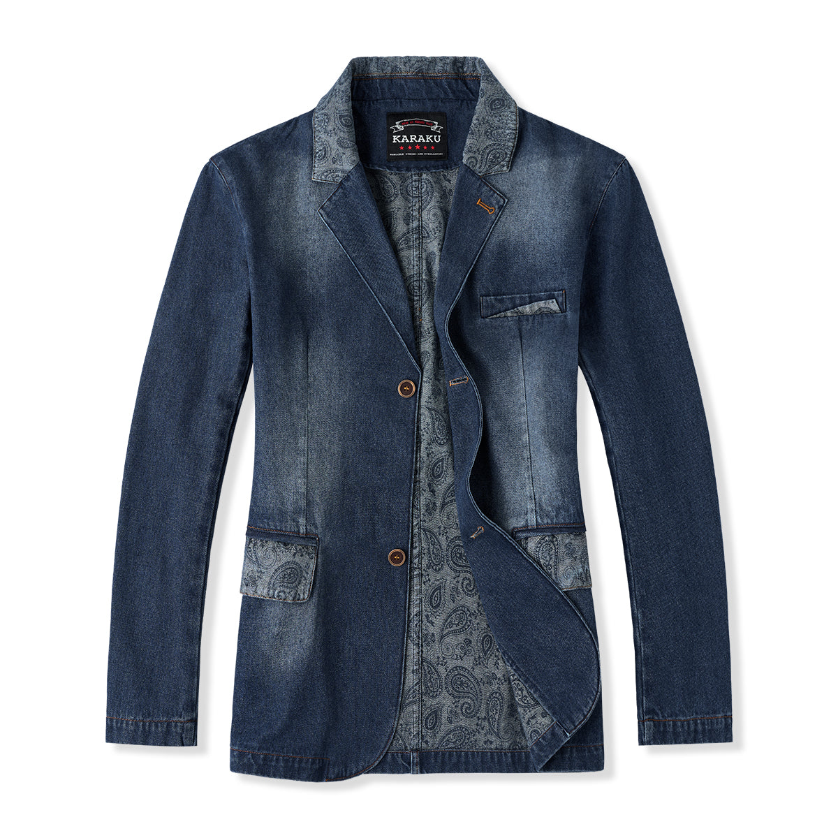 【사전예약】칼라·플랩·안감 페이즐리 패턴 몽키 워싱 가공 데님 테일러드 자켓