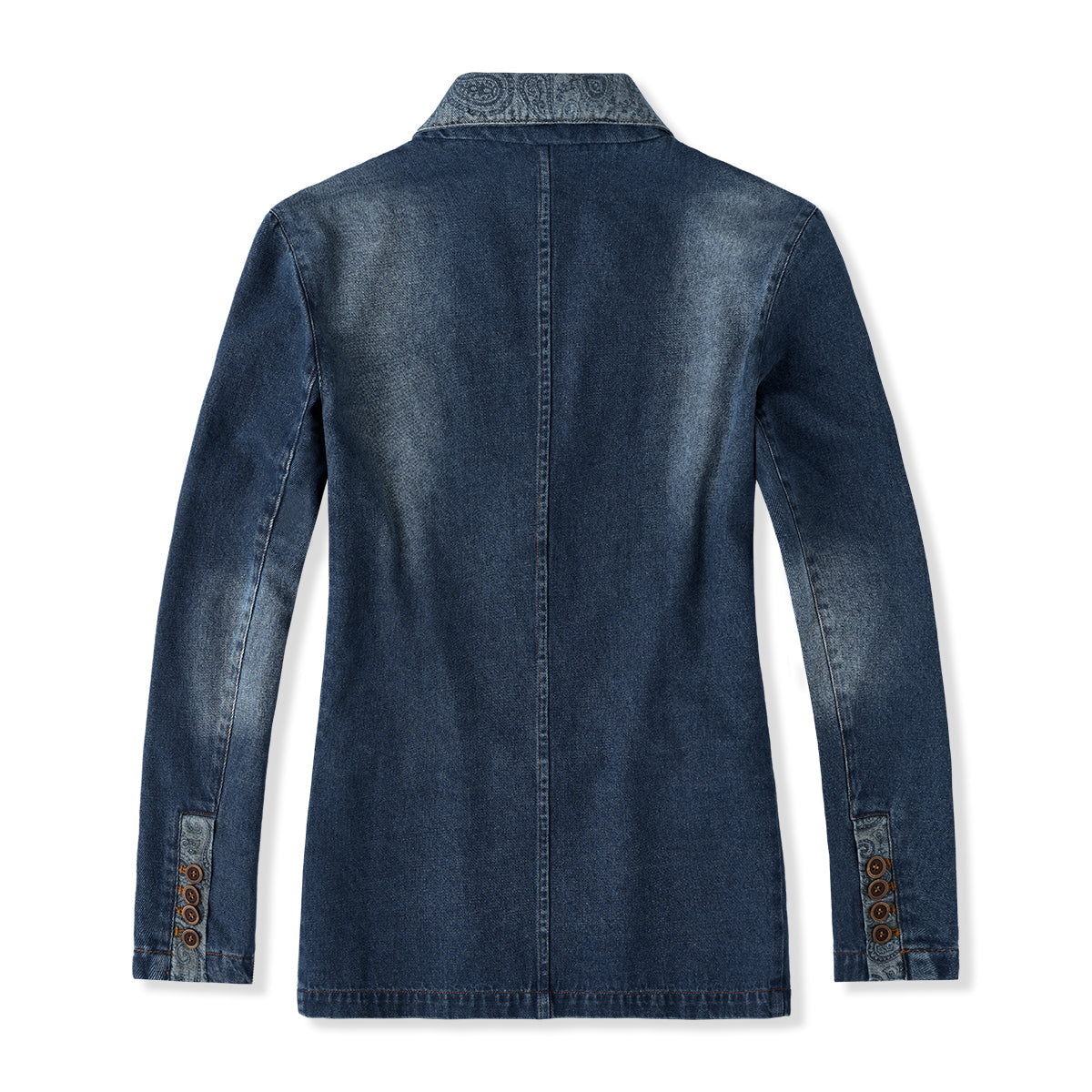 몽키 워싱 가공으로 멋스러운 그라데이션과 색감을 살리고, 페이즐리 패턴과 테일러드 실루엣으로 고급스러운 분위기를 더한 데님 자켓입니다.