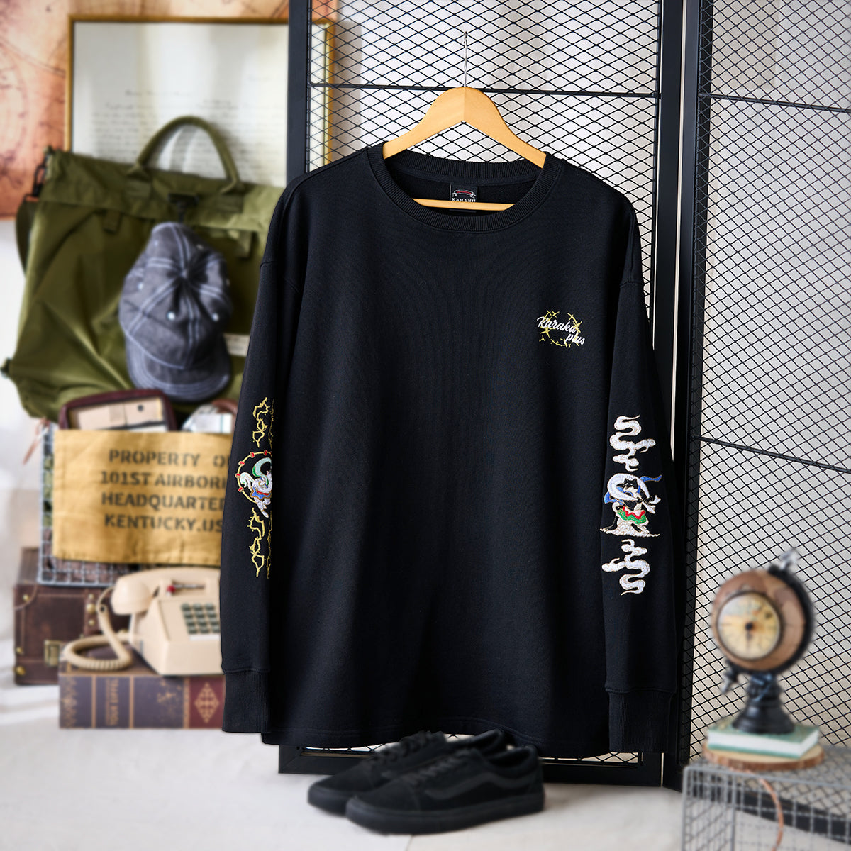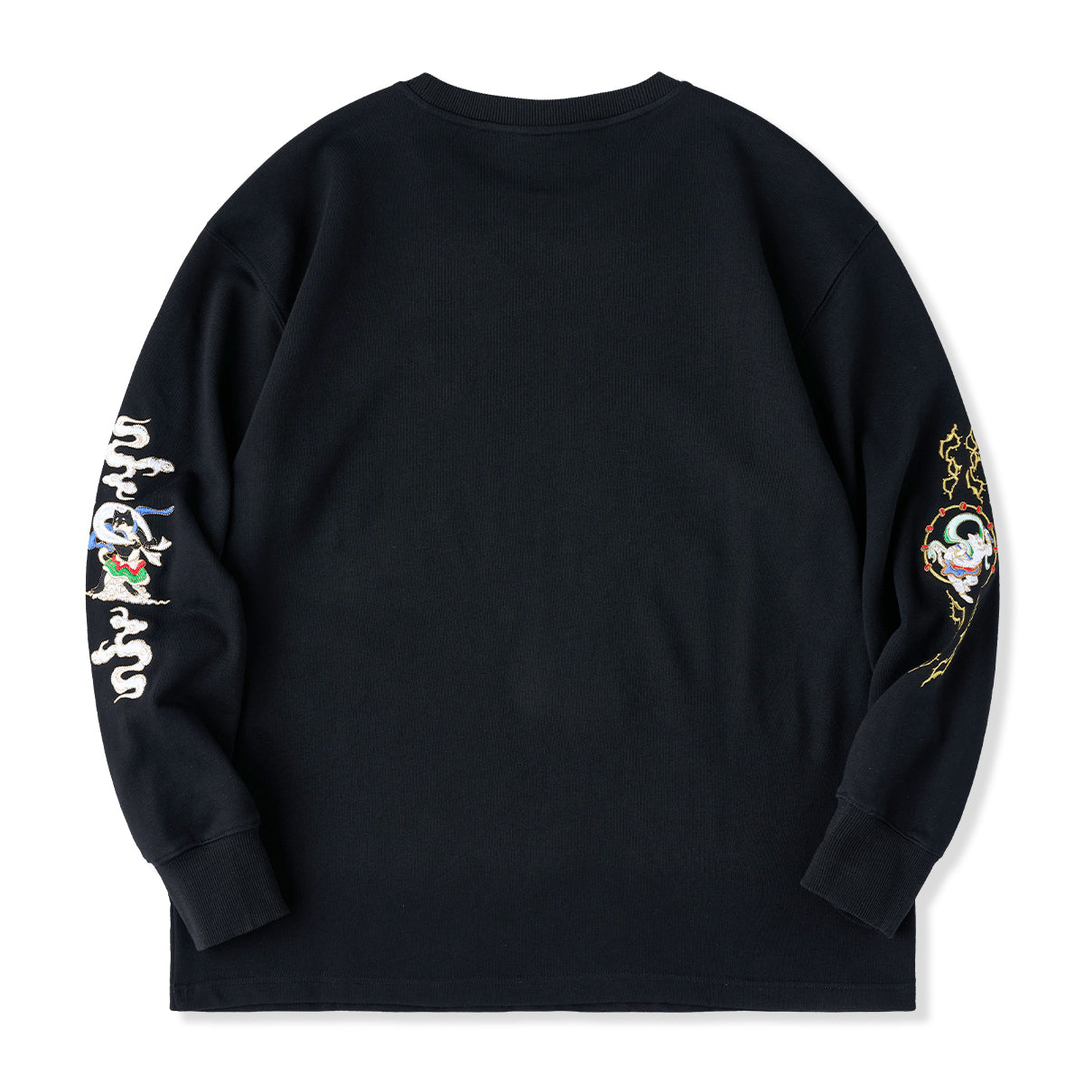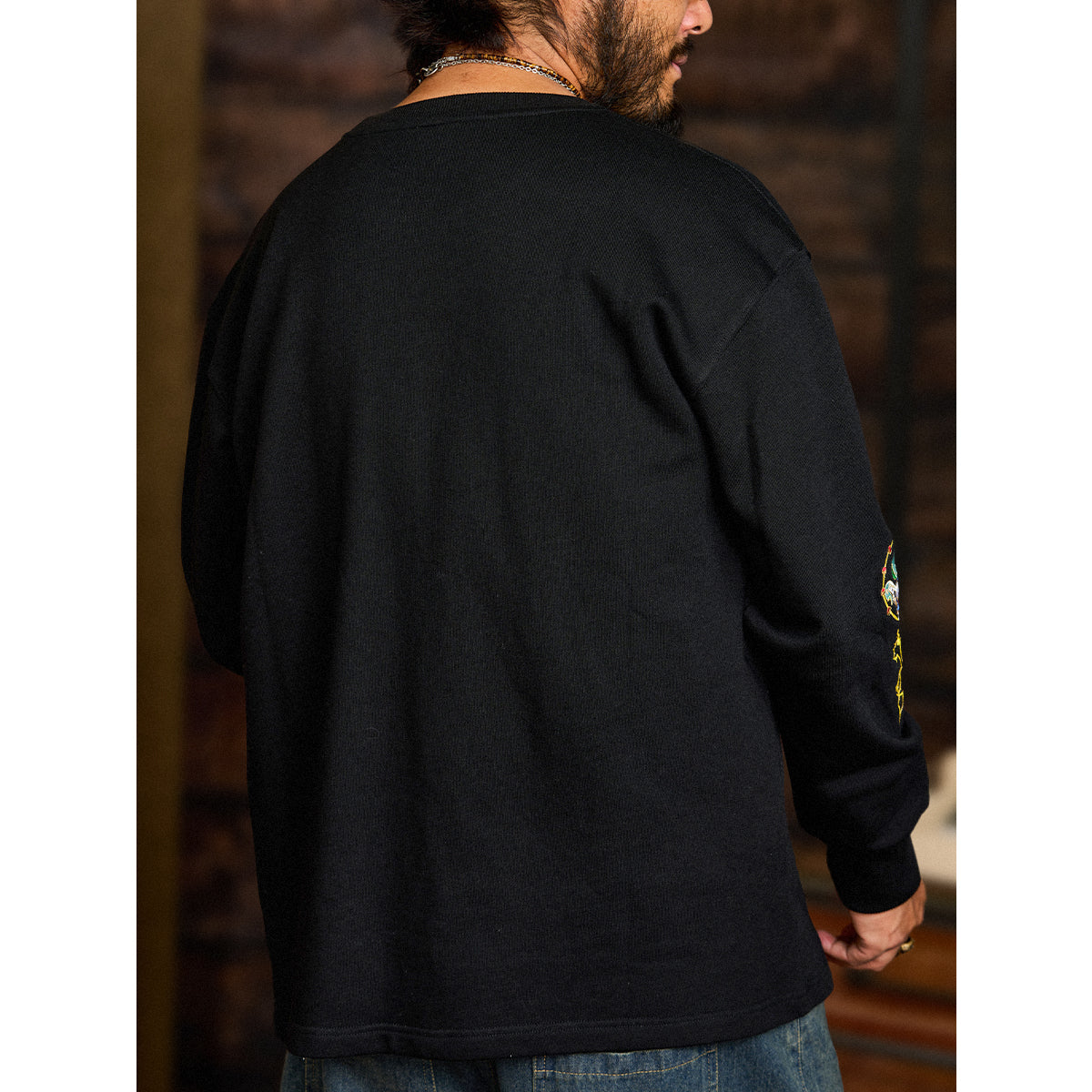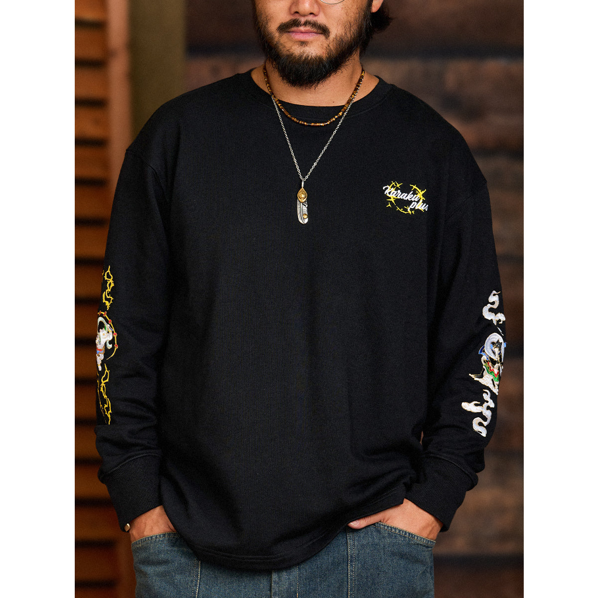전통과 유머가 어우러진 독특한 자수 아트가 돋보이는 크루넥 롱 티셔츠로, 리브 처리로 전체 실루엣이 깔끔하게 완성됩니다.