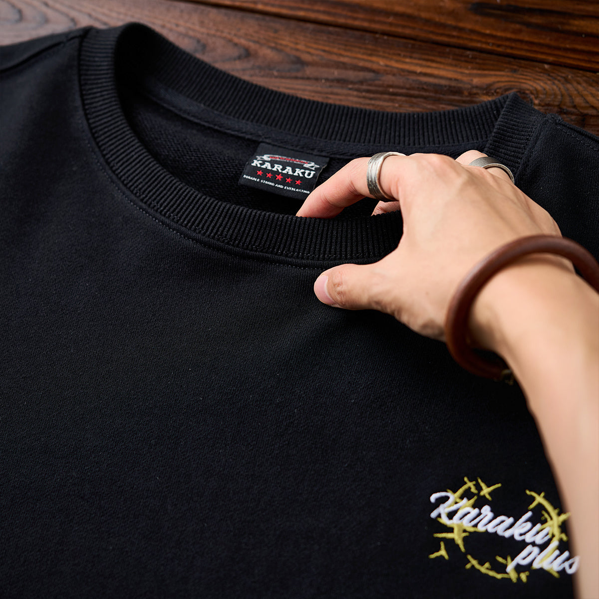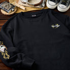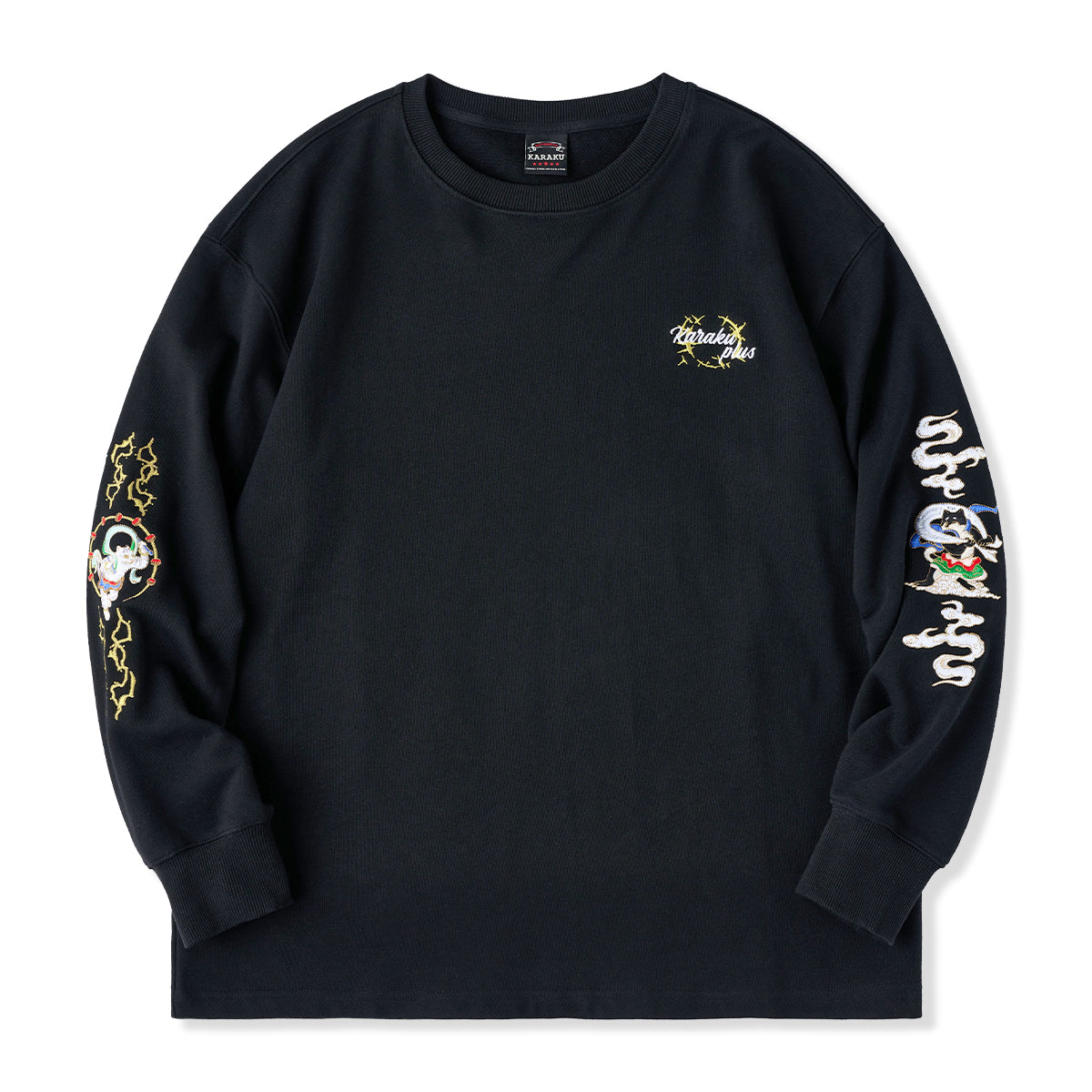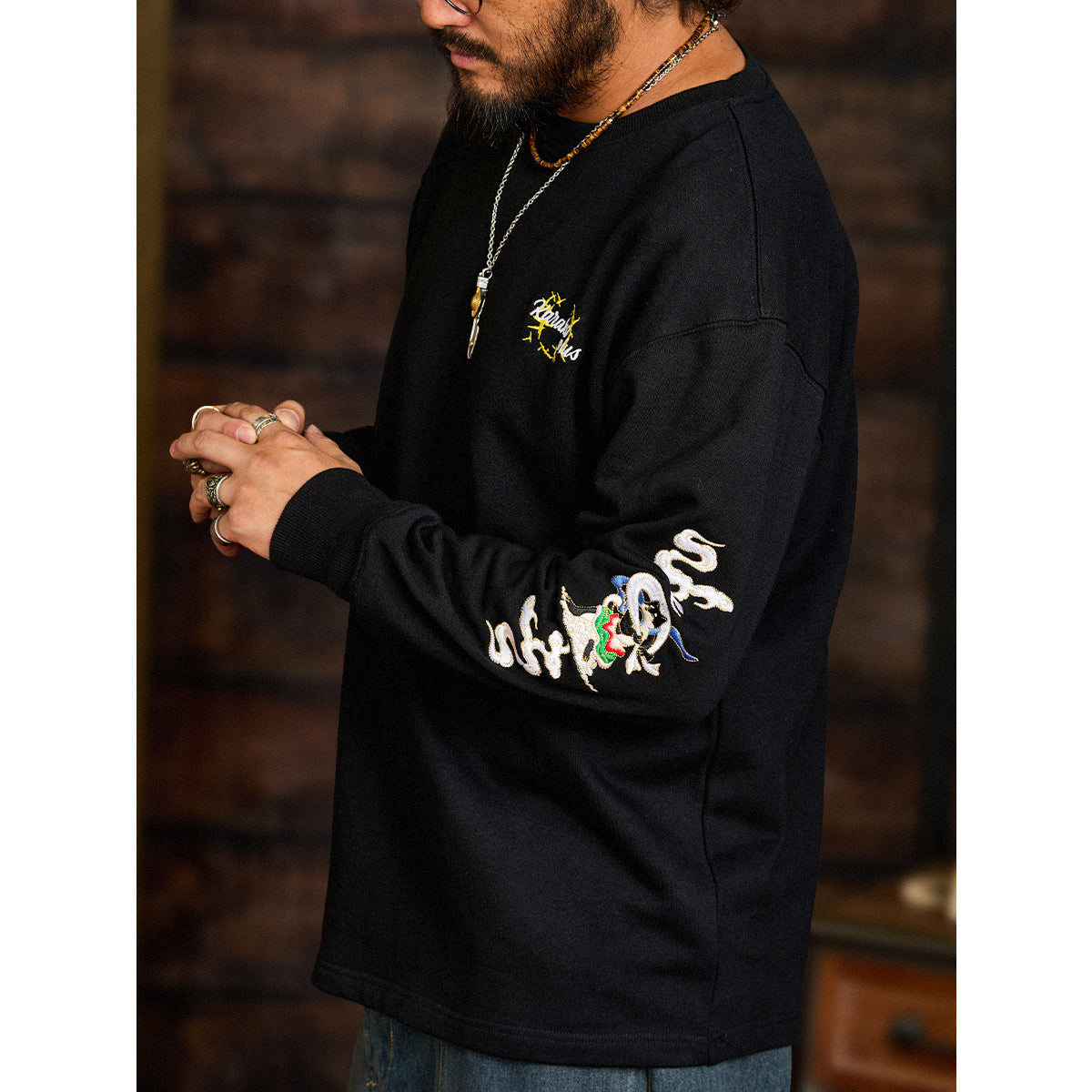 전통과 유머가 어우러진 독특한 자수 아트가 돋보이는 크루넥 롱 티셔츠로, 리브 처리로 전체 실루엣이 깔끔하게 완성됩니다.