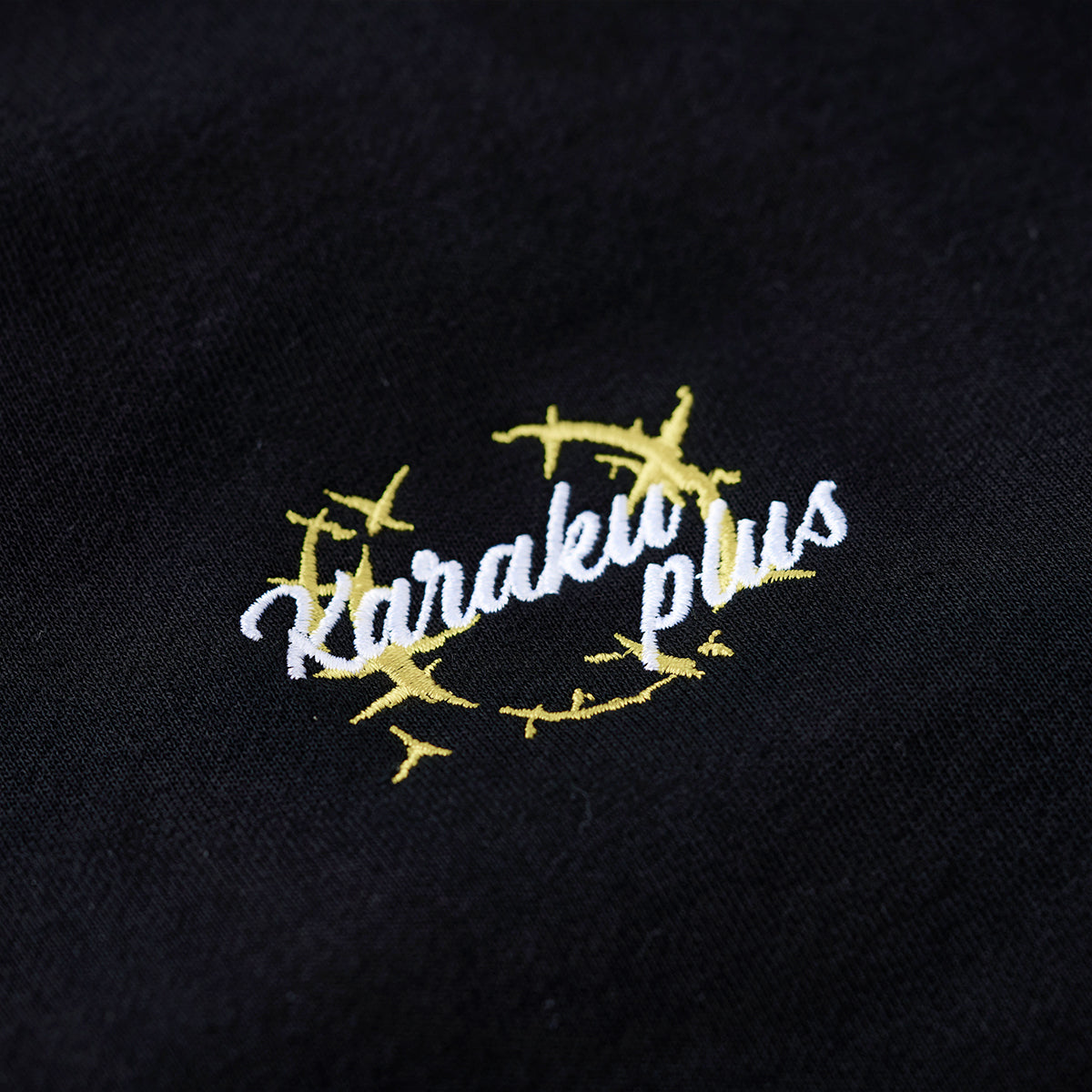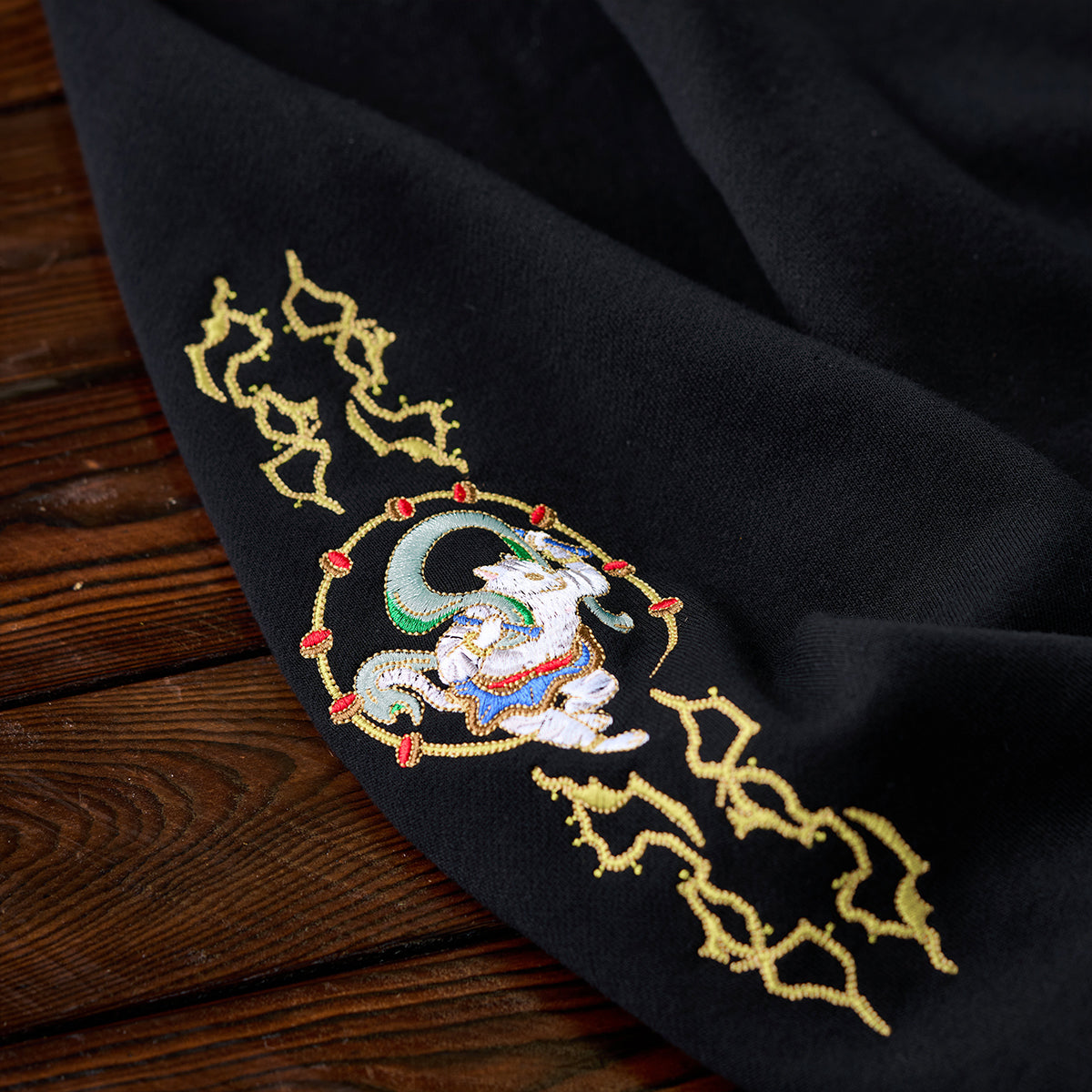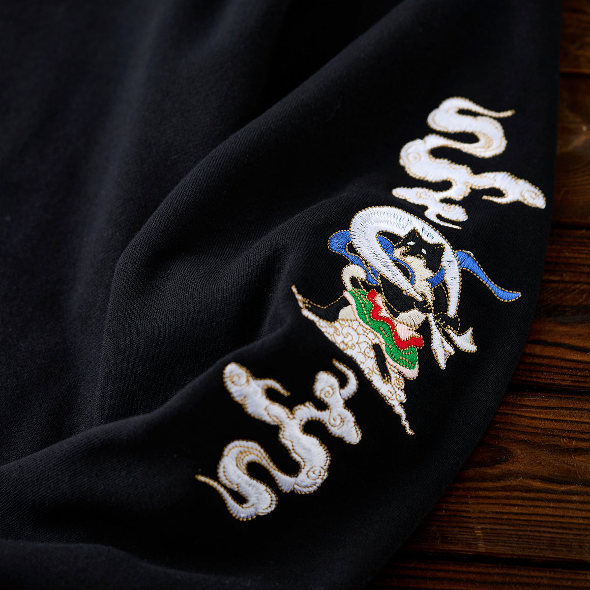 소매에 바람과 번개의 신을 검은 시바견과 흰 고양이로 재치 있게 표현한 자수 아트가 돋보이는 독특한 디자인입니다.