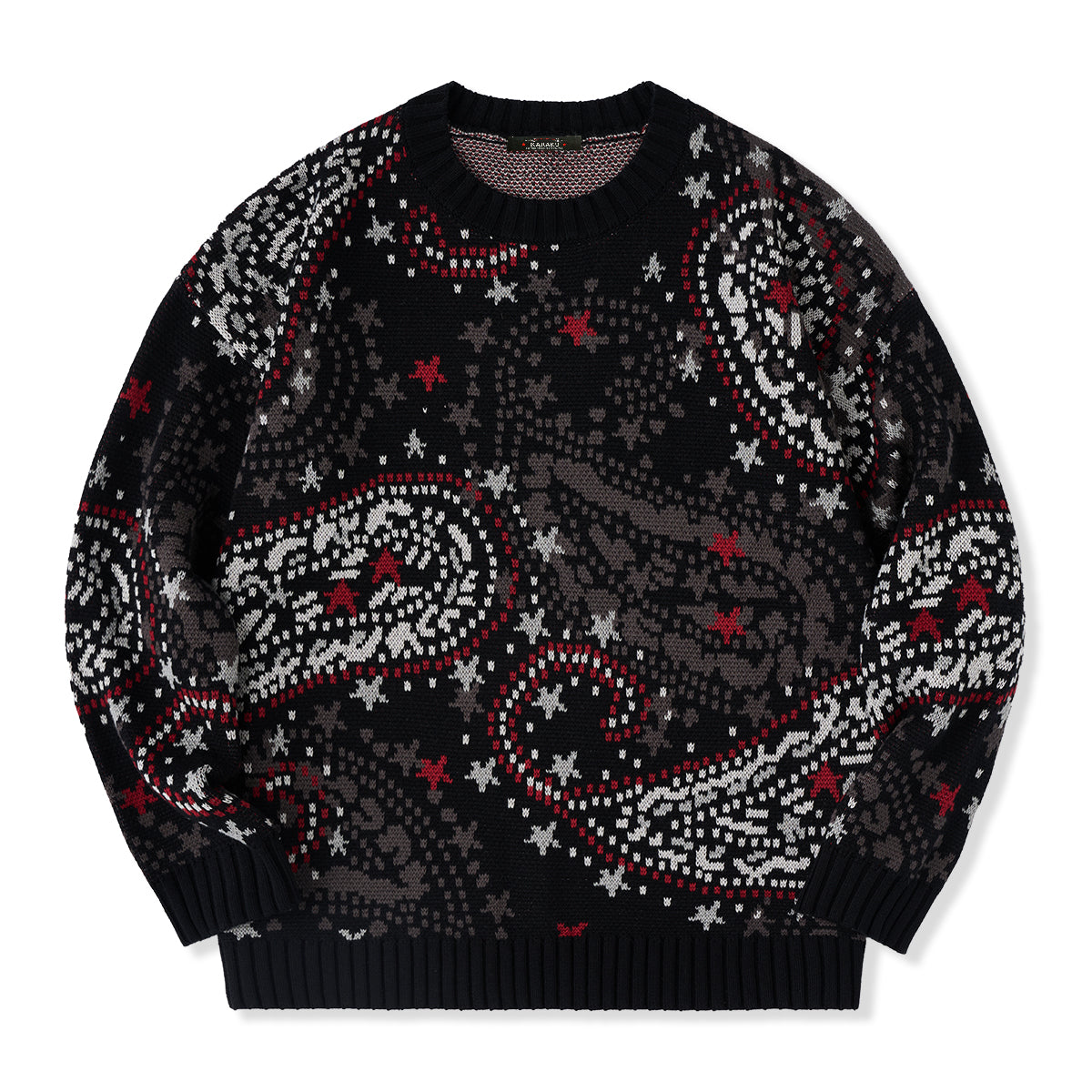 This product has a unique design with a calm base of black, with a paisley pattern in red, gray, and white, as well as a red star pattern. The lightweight and warm acrylic material provides a comfortable fit suitable for fall and winter.