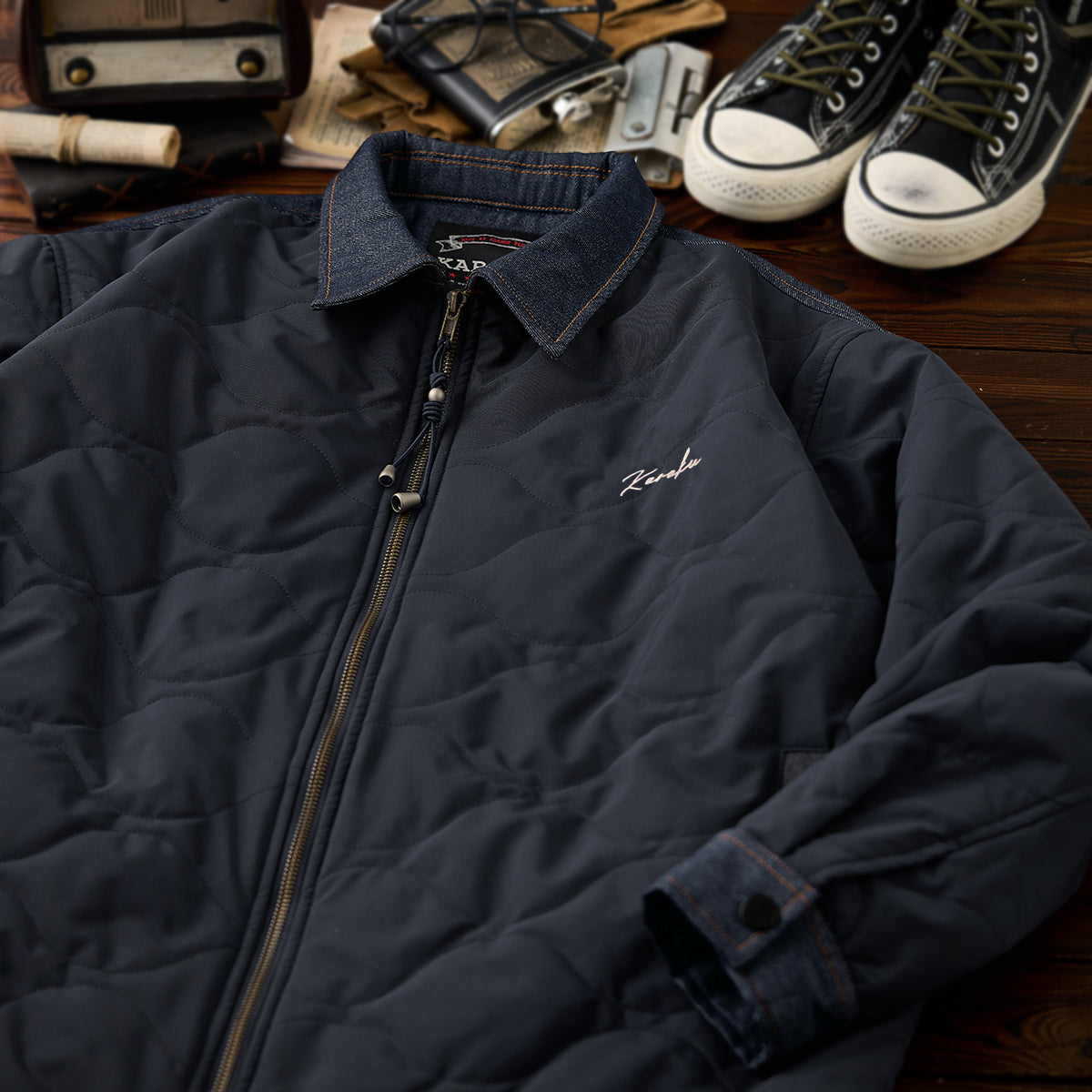 【사전예약】「KaraKu」로고 자수 데님 배색 호박 퀼팅 솜 안감 자켓
