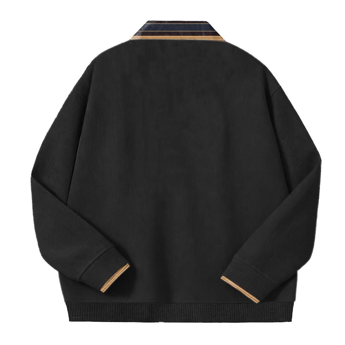 네크라인과 소매단의 멀티 스트라이프 배색이 포인트인 페이크 레이어드 V넥 풀오버 스웨트로, 캐주얼부터 단정한 스타일까지 아우르는 범용성이 넓습니다.