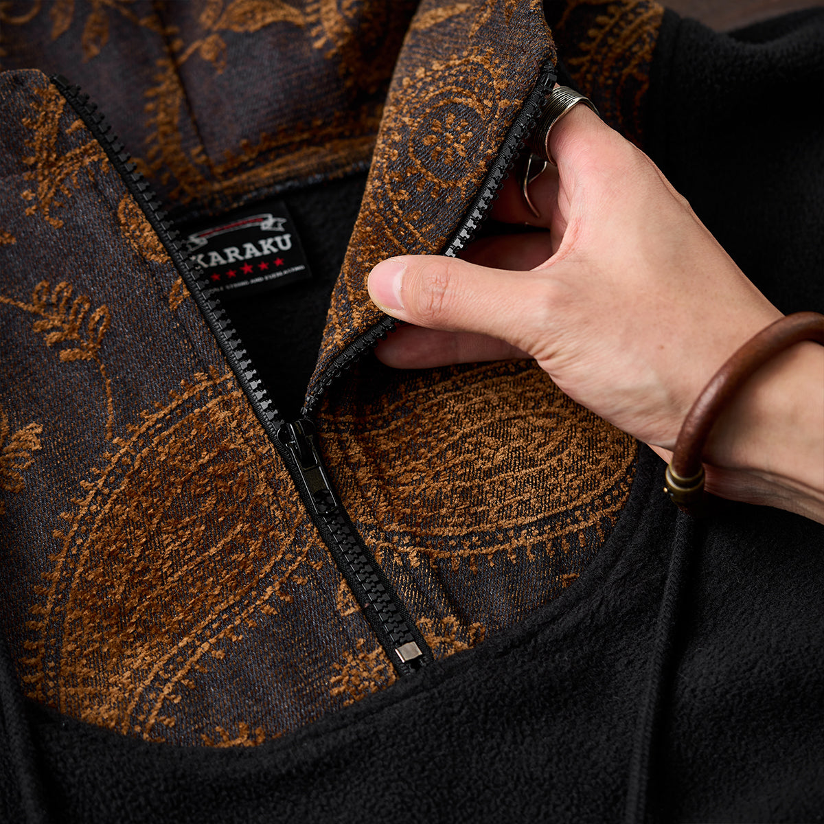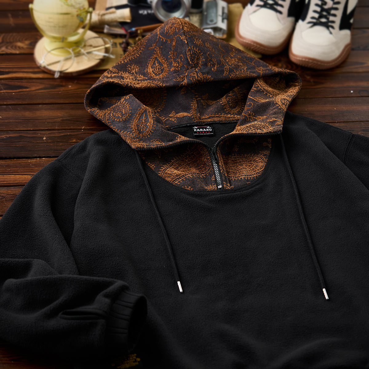 부드러운 플리스와 페이즐리 패턴 쉐니르 배색의 하프 집업 후드 스웨트셔츠로, 페이즐리 패턴이 빈티지한 무드를 연출합니다.