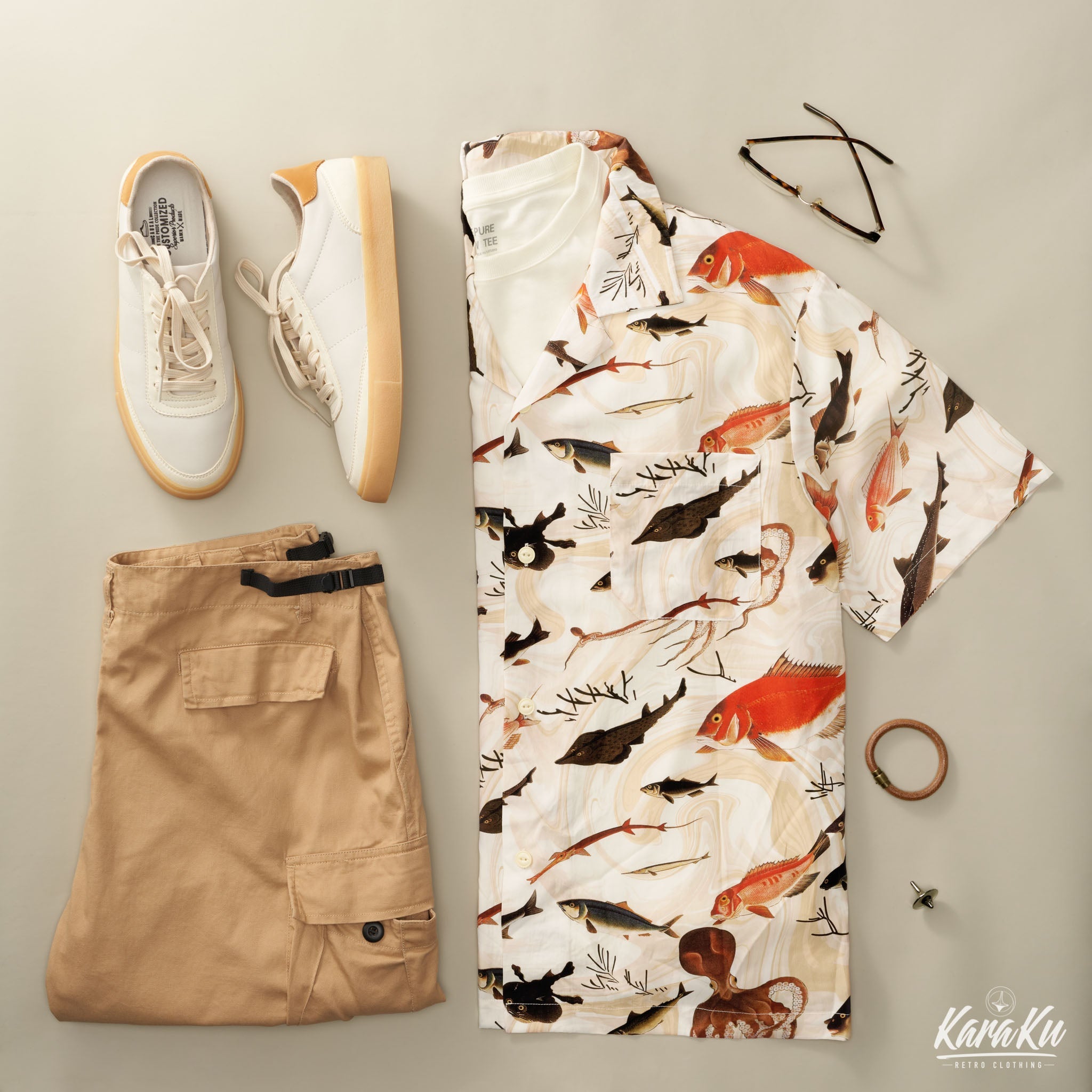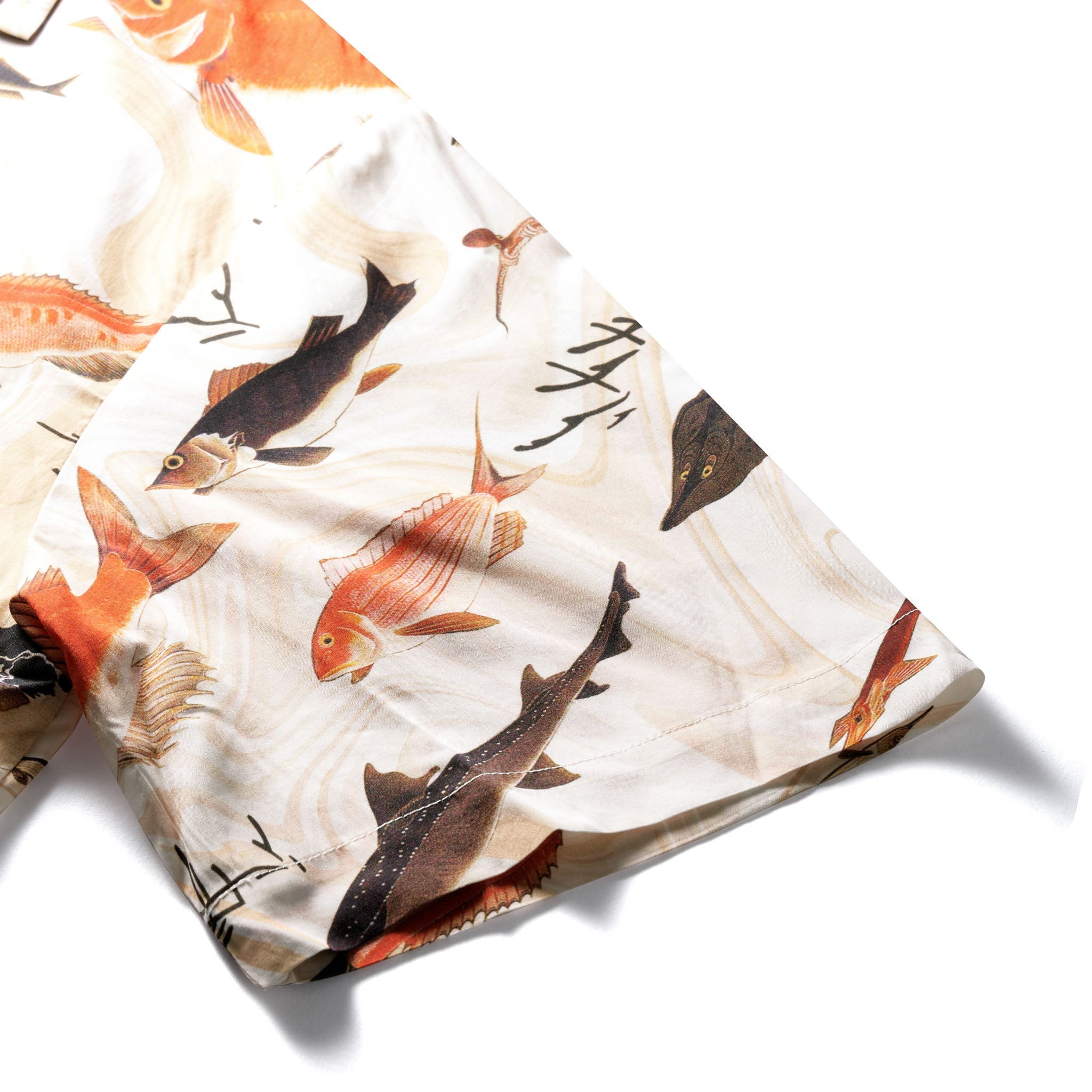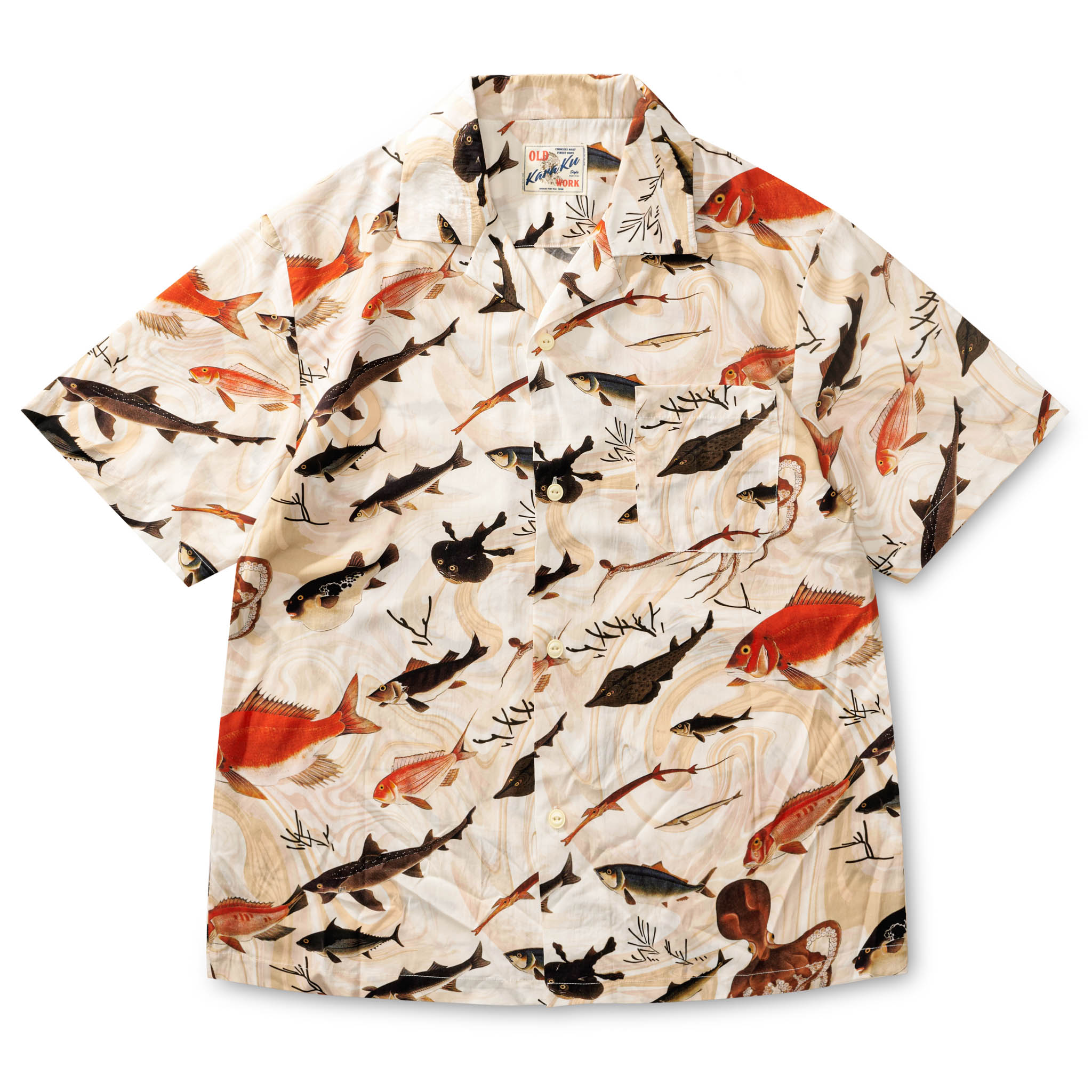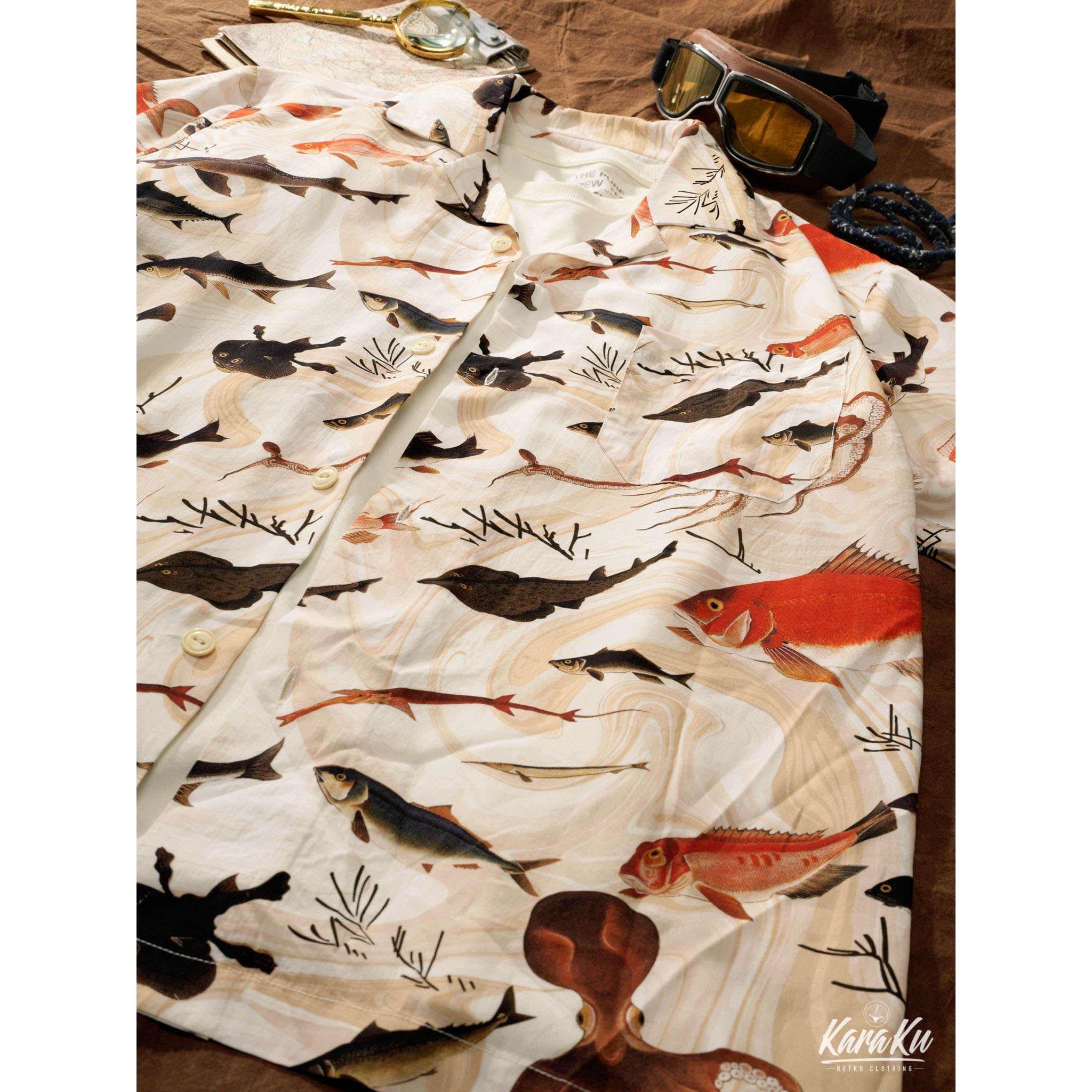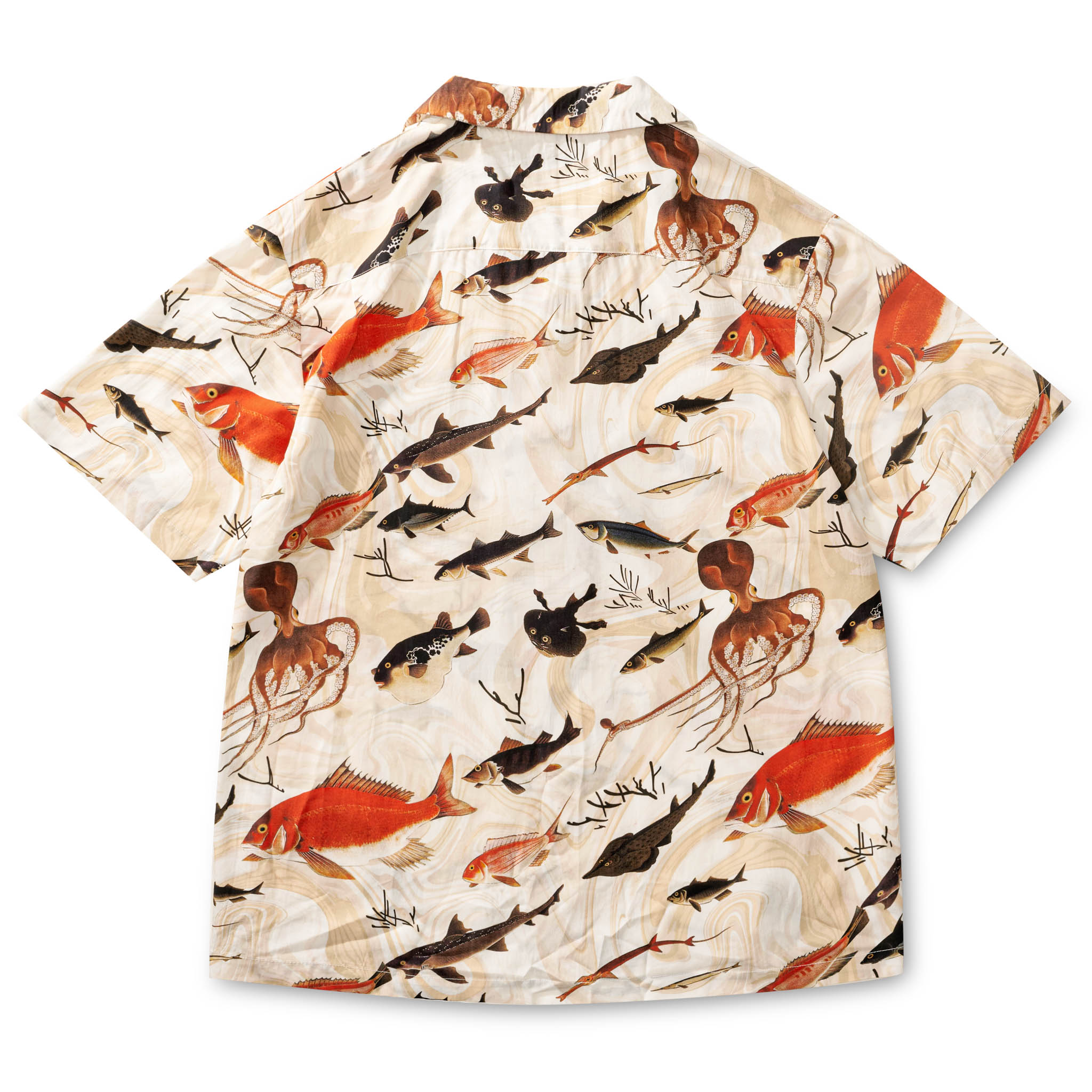 이 아이템은 이토 자쿠추가 1757년부터 1766년경에 걸쳐 제작한 대표작 《동식채회》 중 27번째 작품 《문어》를 모티브로 디자인된 셔츠입니다. 바닷속을 헤엄치는 16종의 물고기가 그려져 있으며, 화면 중앙의 큰 문어 다리에는 어린 문어가 얽혀 있는 독특한 구성이 특징입니다. 화려하고 세밀한 화풍이 돋보이며, 근대 초현실주의를 연상시키는 환상적인 분위기와 재미를 느낄 수 있습니다.
