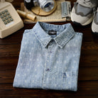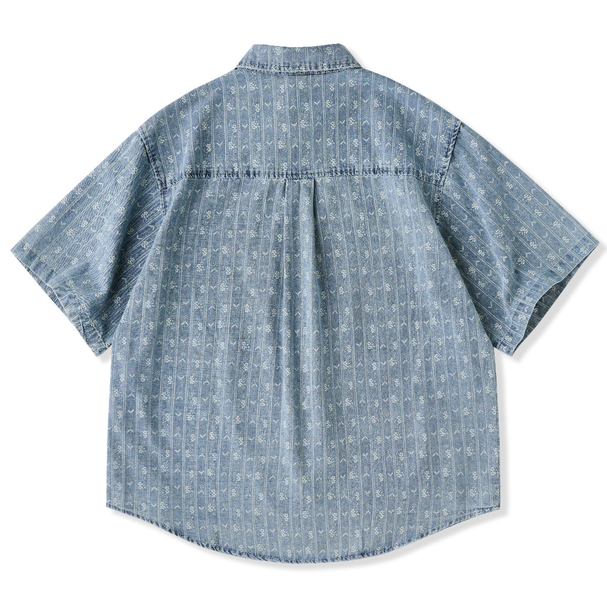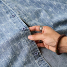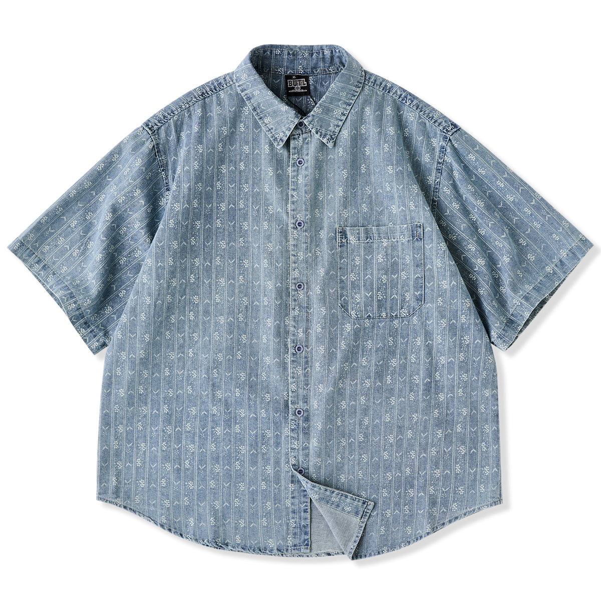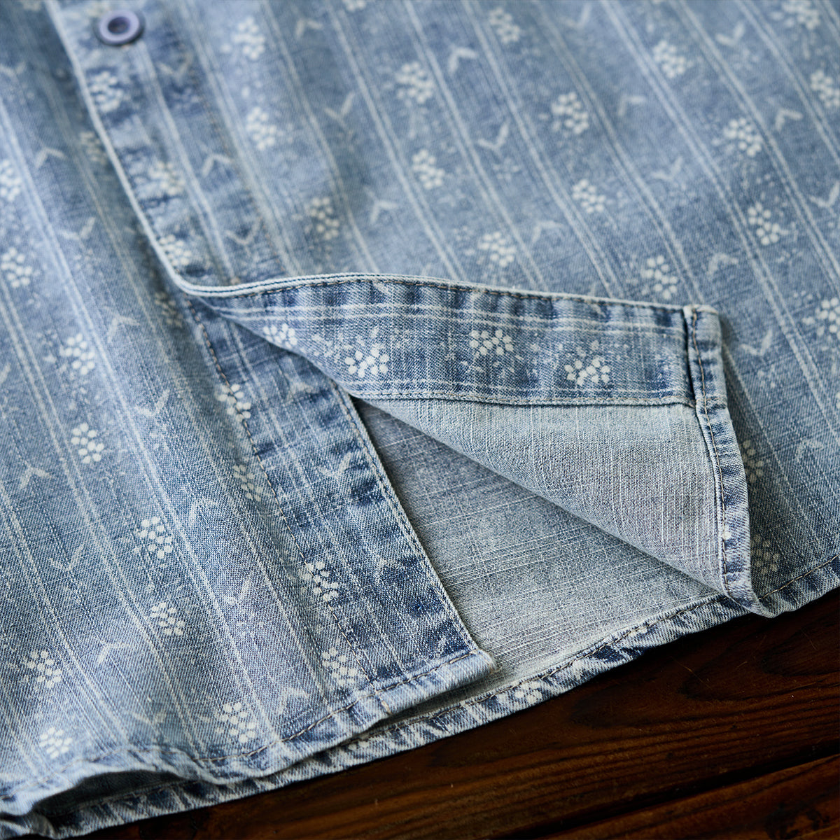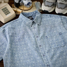 잔꽃과 화살표 무늬가 돋보이는 부드러운 데님 셔츠로, 클래식하고 고급스러운 느낌을 줍니다.