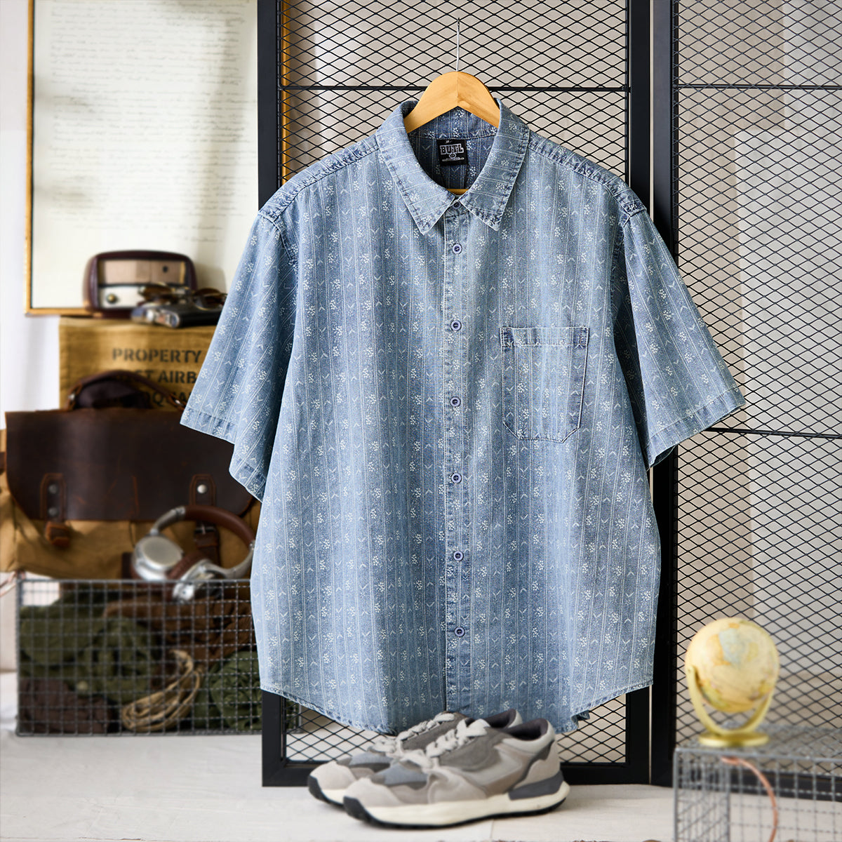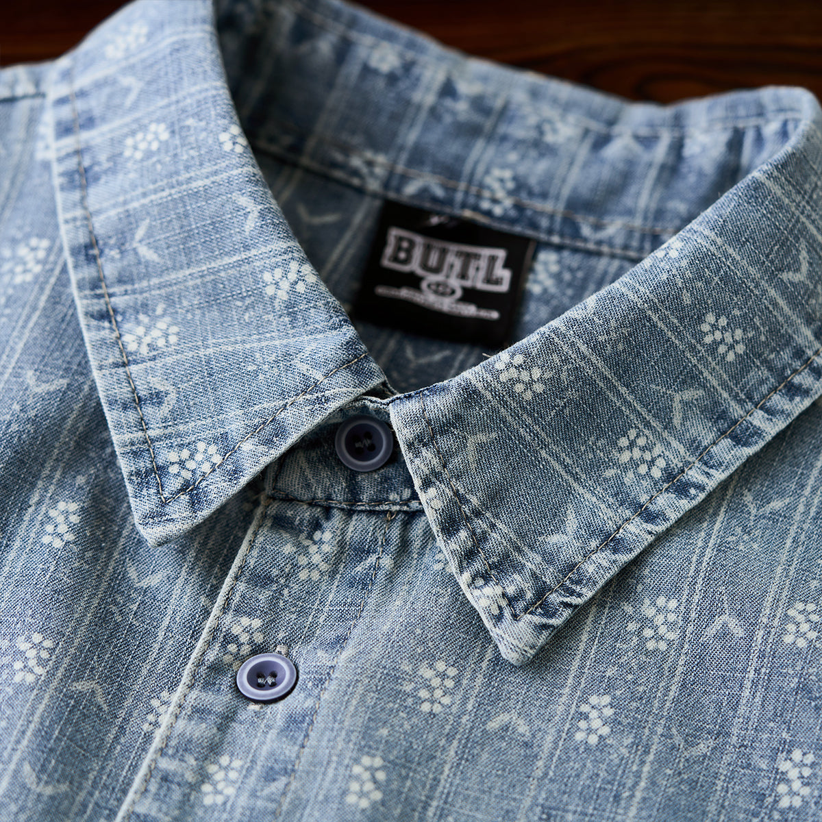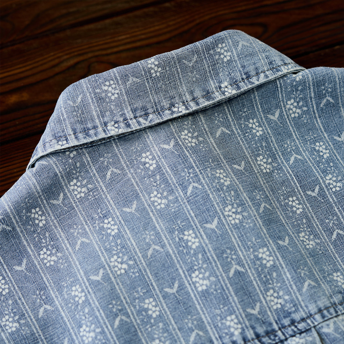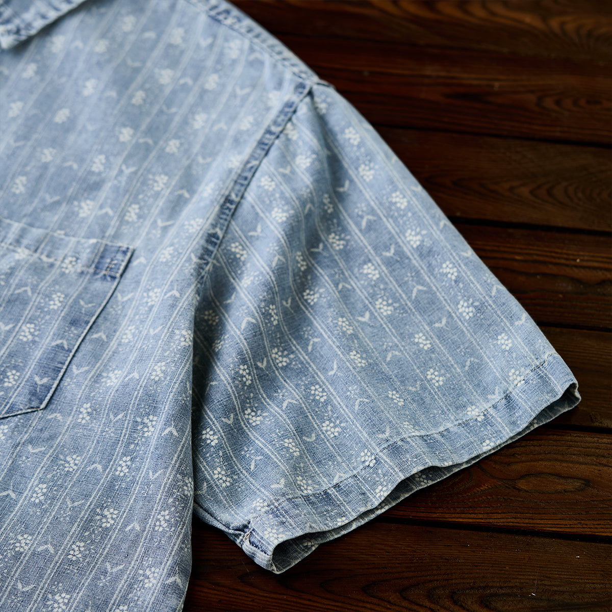 잔꽃과 화살표 무늬가 돋보이는 부드러운 데님 셔츠로, 클래식하고 고급스러운 느낌을 줍니다.