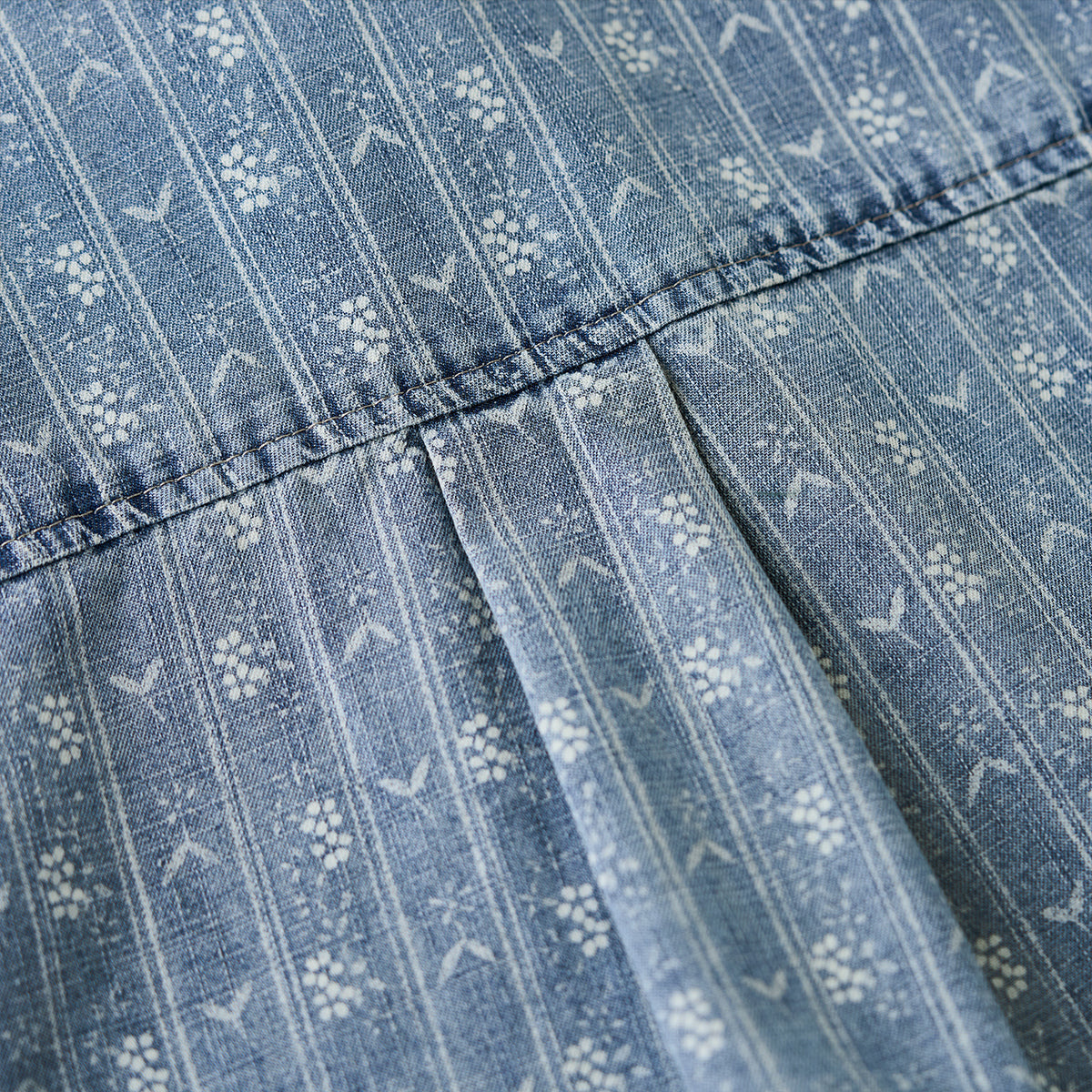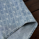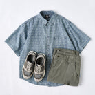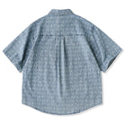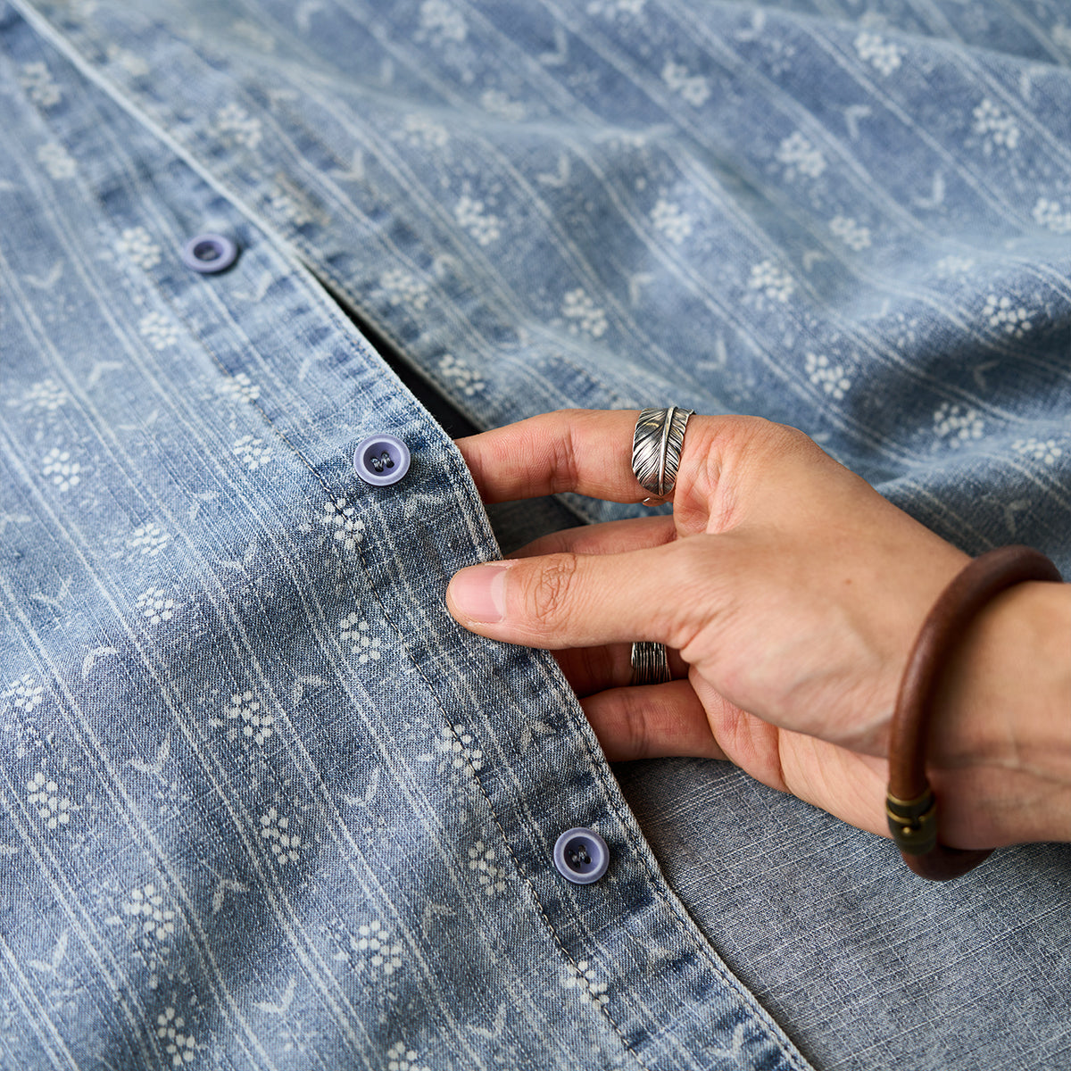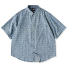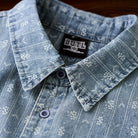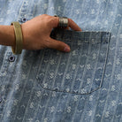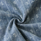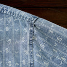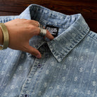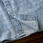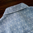 섬세한 잔꽃 무늬와 화살표 모양의 패턴이 스트라이프 형태로 반복되어 팝적인 매력과 고급스러움을 동시에 갖췄습니다. 일반 데님 셔츠보다 시각적 임팩트가 커서 코디에 포인트를 줍니다.