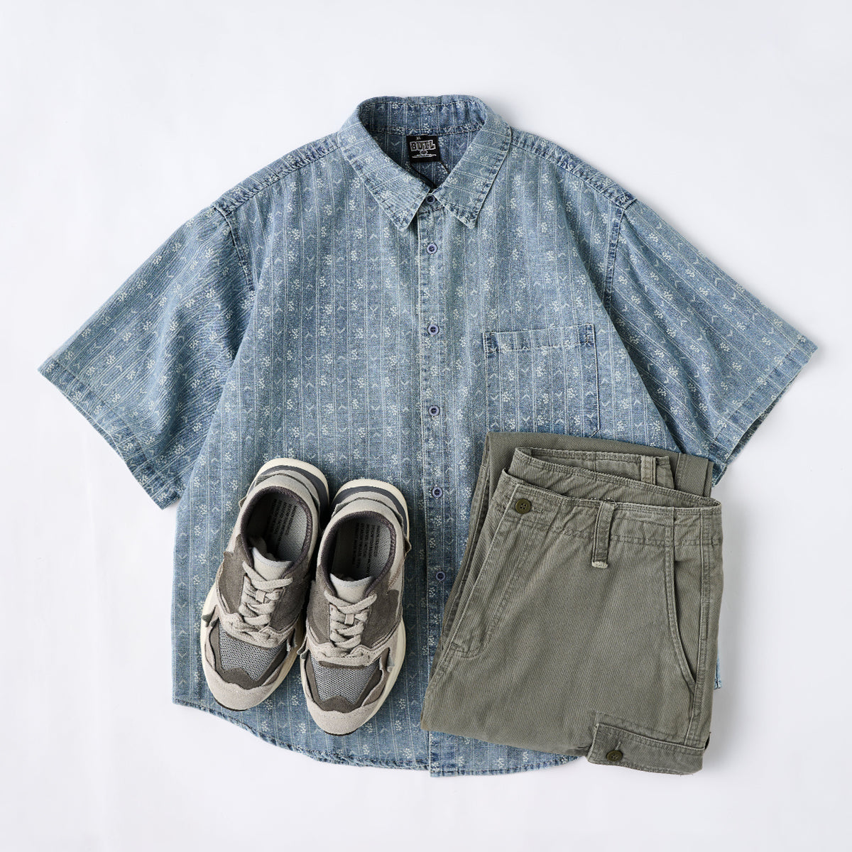 흰색이나 회색의 무지 티셔츠와 레이어드하면 셔츠의 패턴이 더욱 돋보입니다. 연한 블루 톤은 베이지색 치노 팬츠나 화이트 데님 팬츠와 잘 어울려 밝고 세련된 스타일링이 가능합니다.