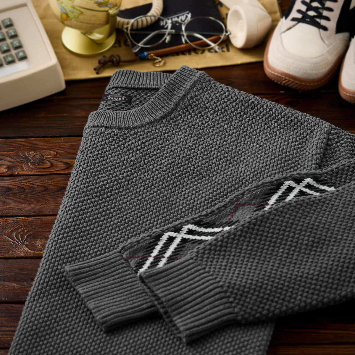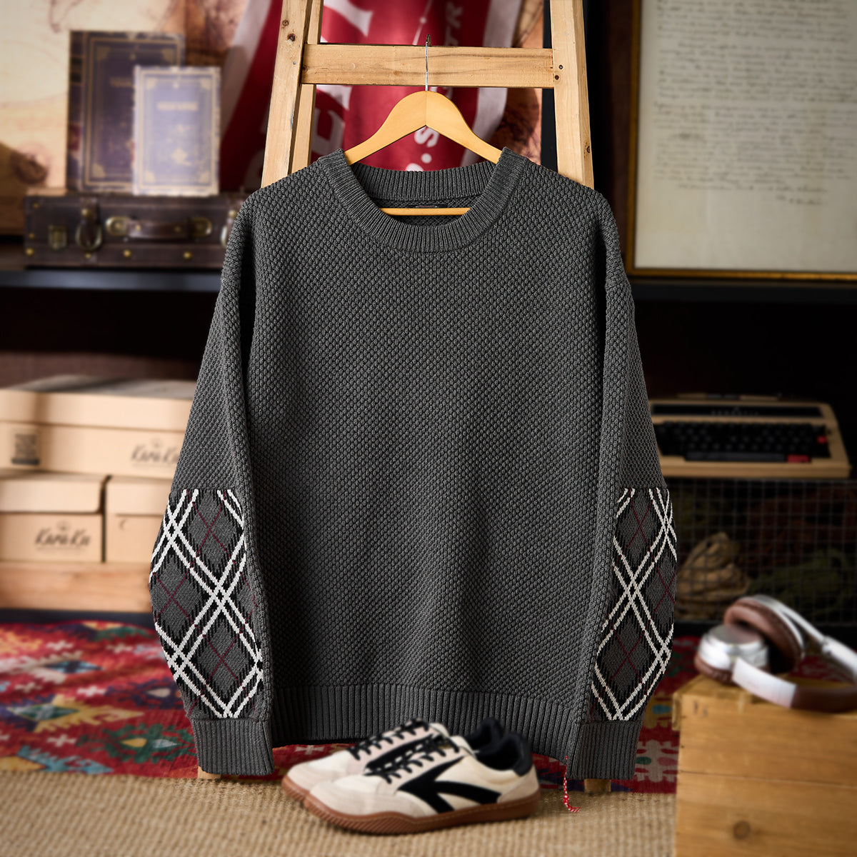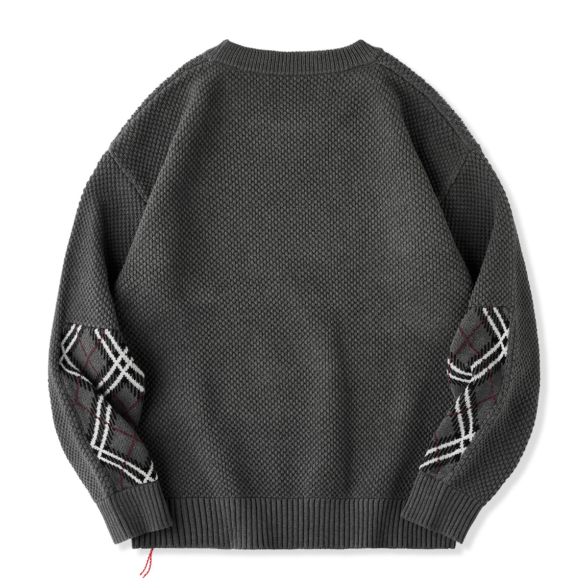 입체감 있는 파인애플 조직 짜임과 팔꿈치 아가일 체크 배색, 밑단 빨간 끈이 포인트인 니트 스웨터입니다. 적당한 두께와 폭신한 착용감으로 가을·겨울 데일리 룩에 활용하기 좋습니다.