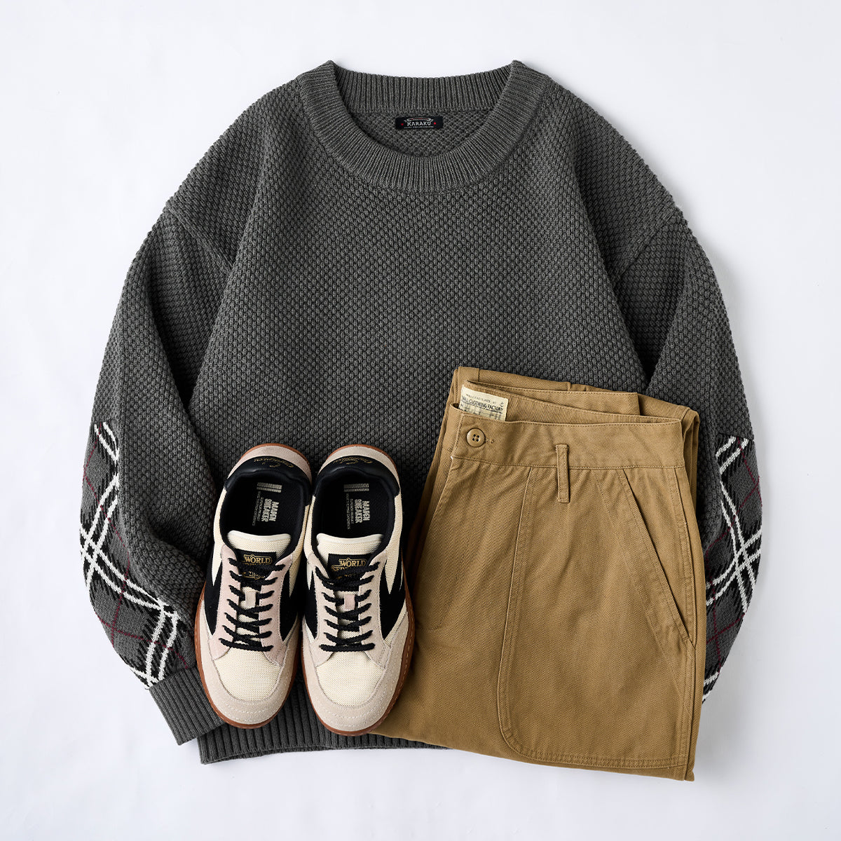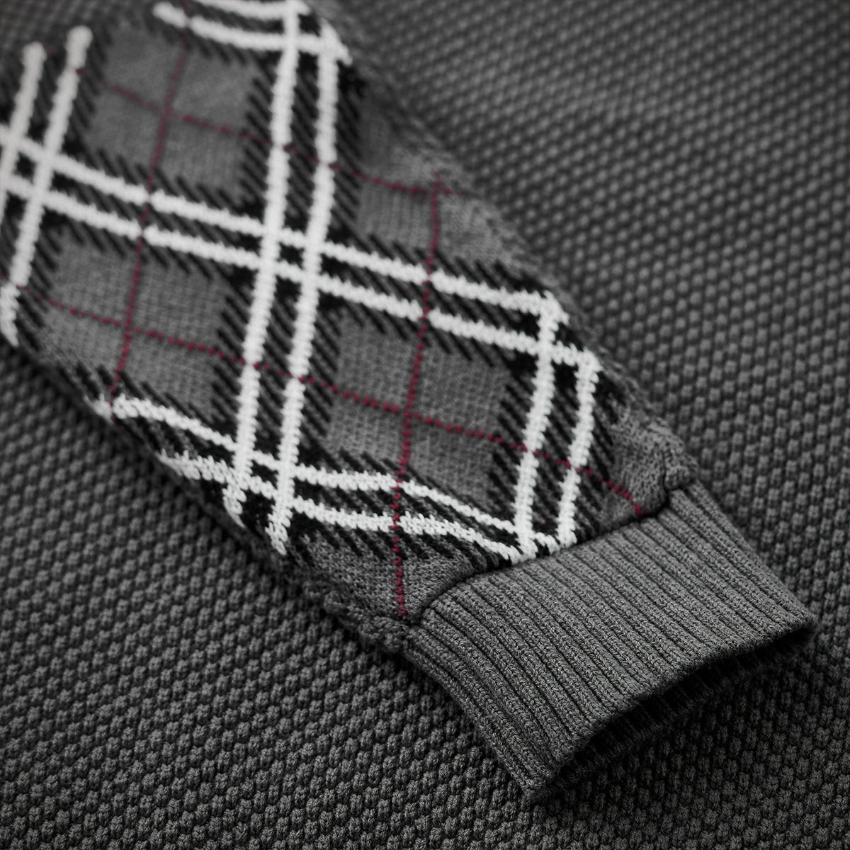 팔꿈치 부분에 아가일 체크 자카드 짜임으로 오목·볼록한 짜임이 만들어내는 음영과 클래식한 아가일 패턴이 절묘하게 조화를 이루어, 단독으로 코디의 포인트가 되는 디자인입니다.