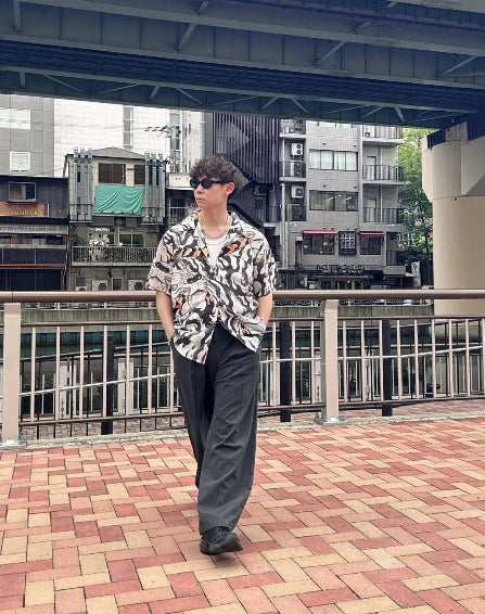 KARAKU×石黒亜矢子「꼬리 무는 백호」무늬프린트 텐셀 알로하 셔츠
