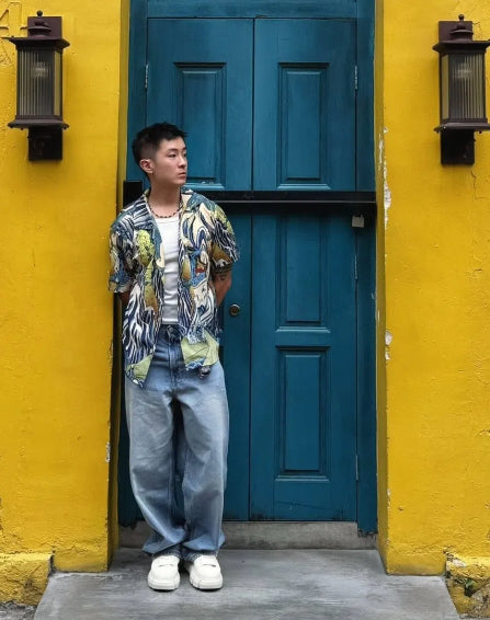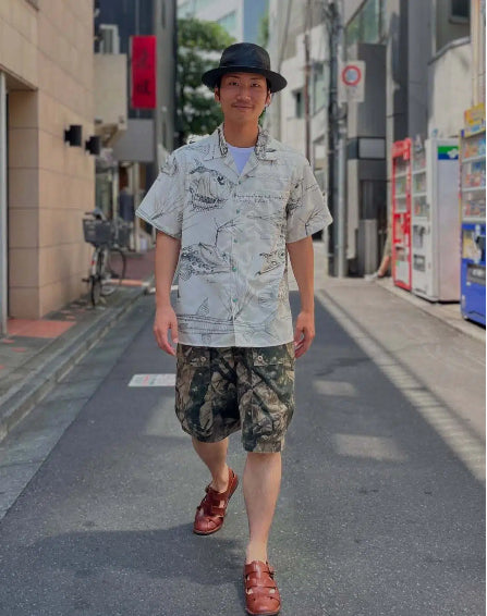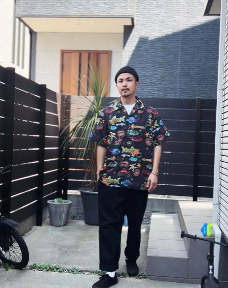 손그림「심해 생물 도감」터키석 단추 오픈칼라 셔츠