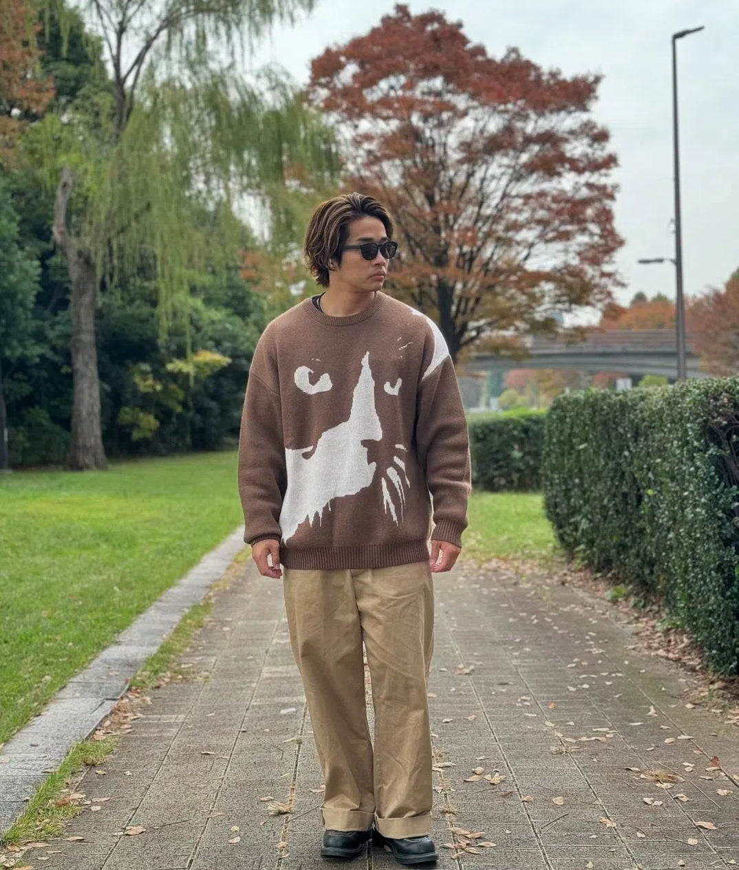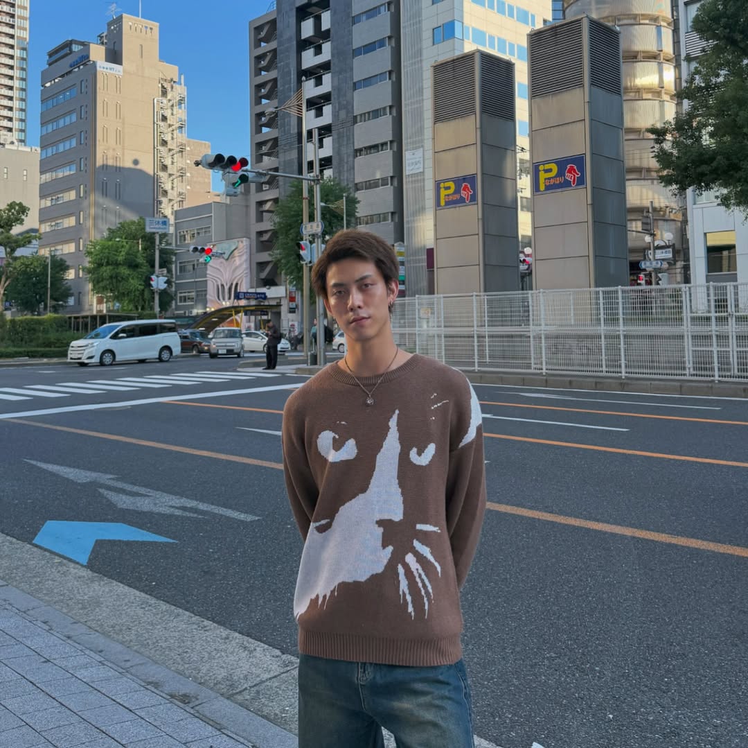 「어둠 속에 숨어 있는 고양이」자카드직 울혼방 니트 스웨터