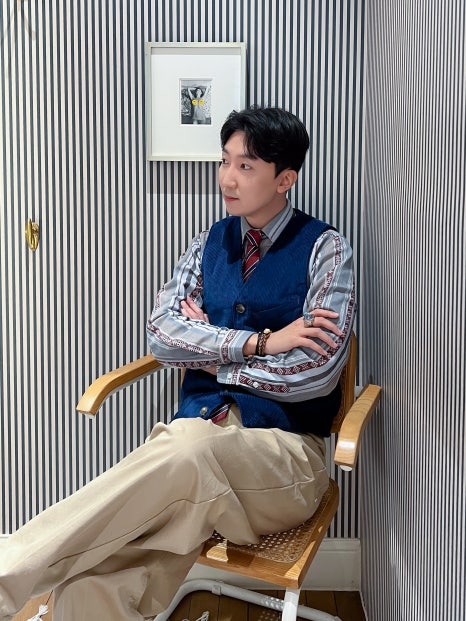 트리플 스트라이프 무늬 오픈 카라 워크 긴팔 셔츠