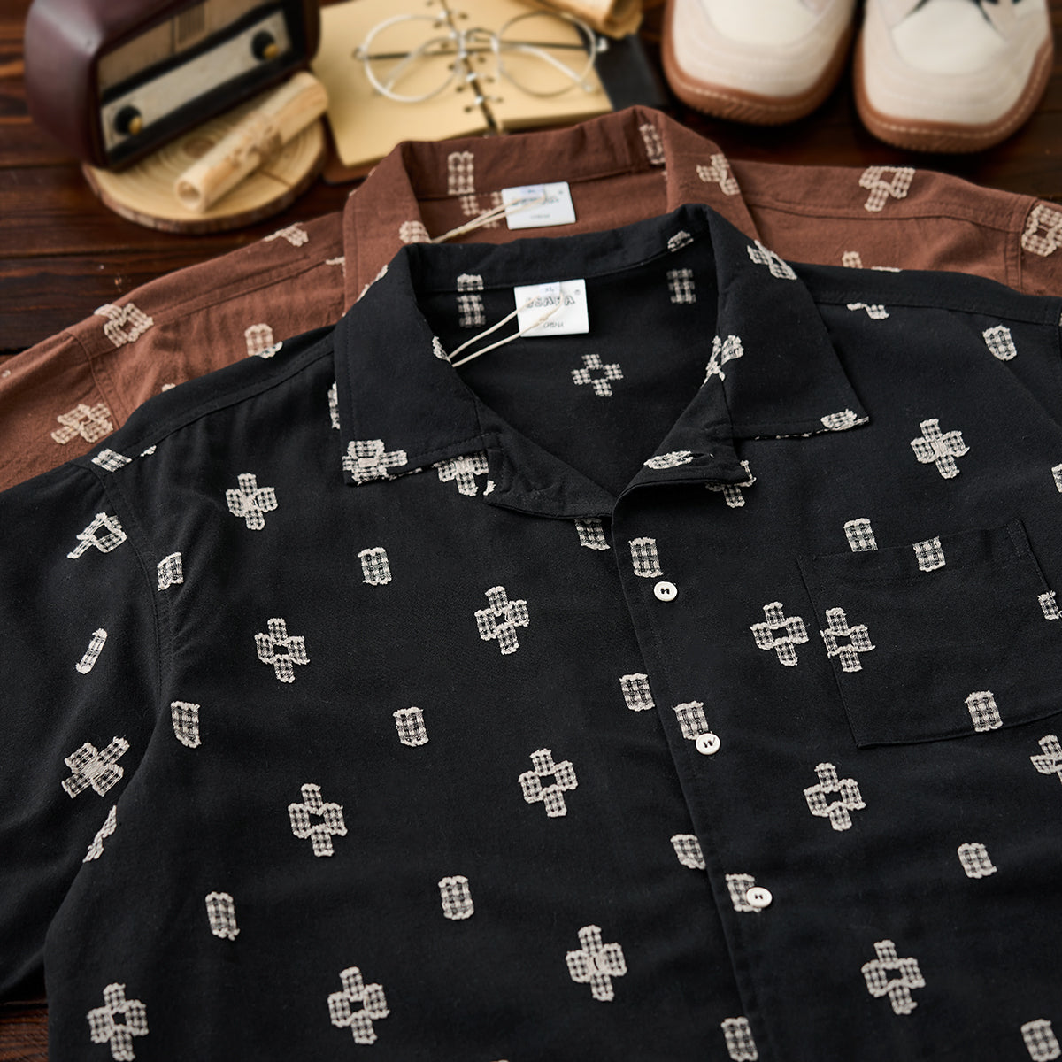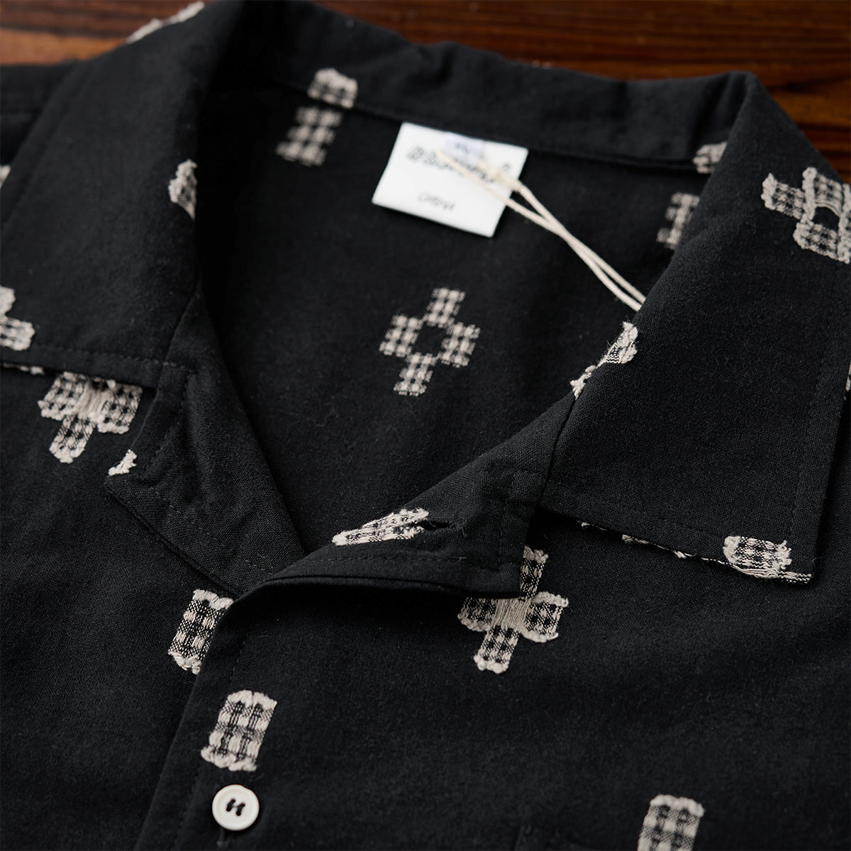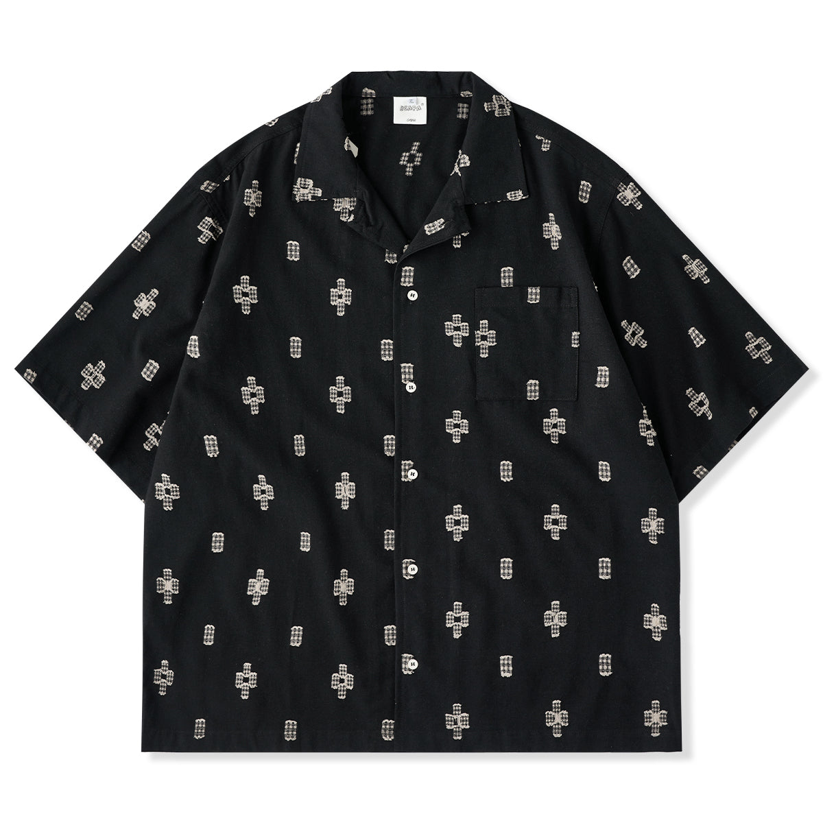 기하학 자수 쿠바 칼라 루즈핏 코튼 셔츠