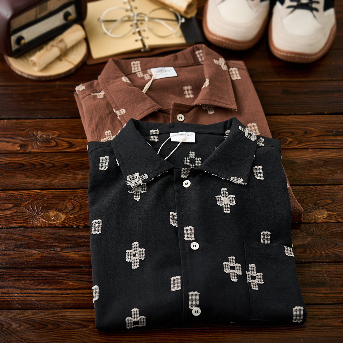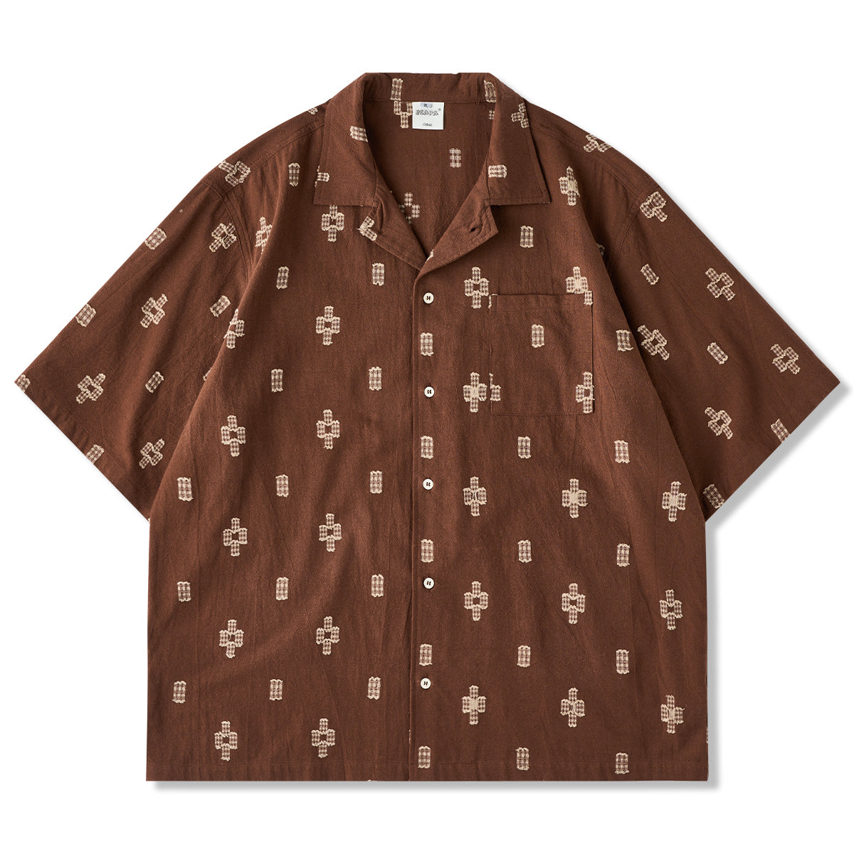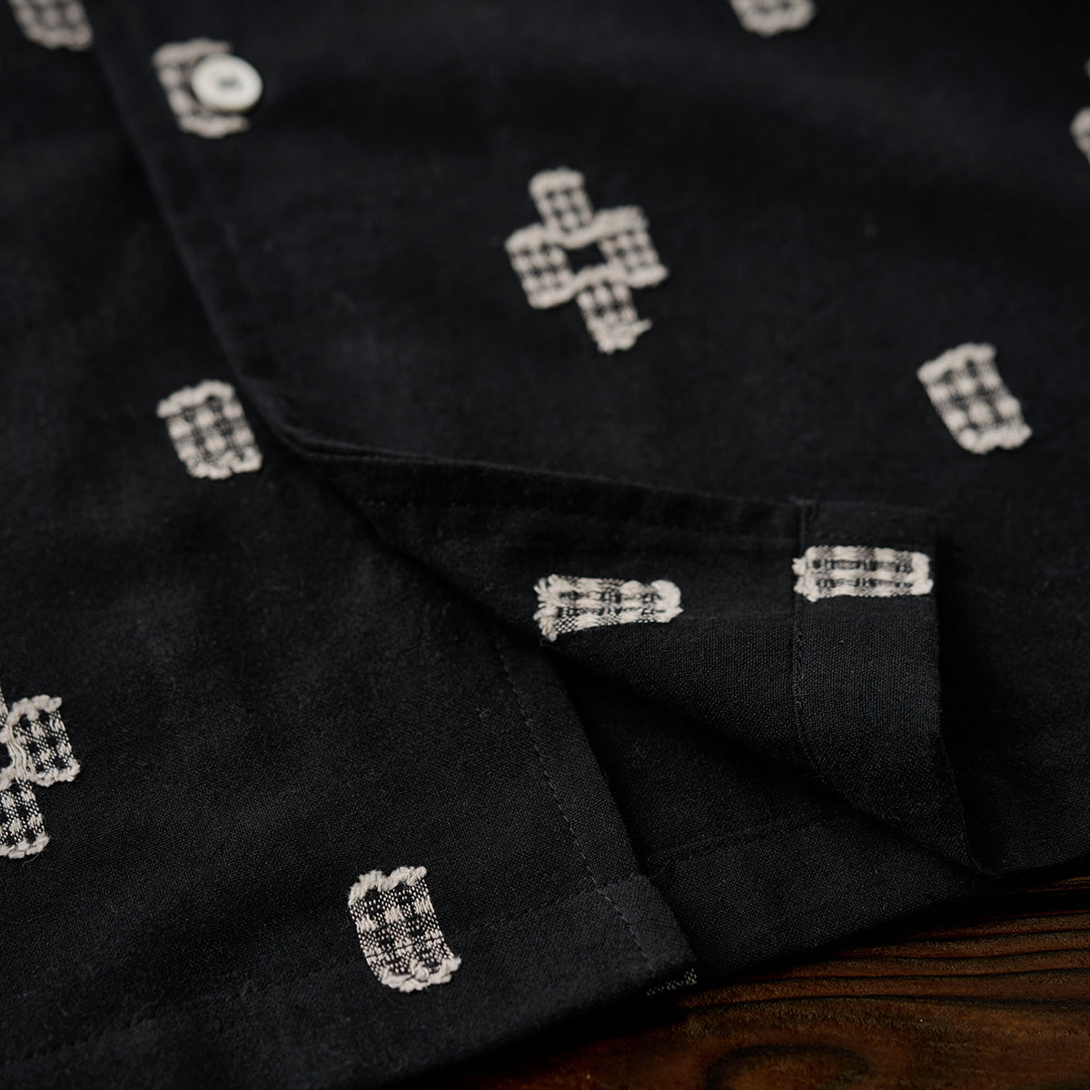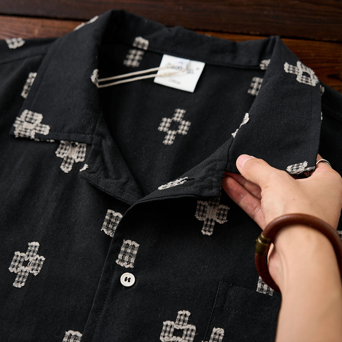 기하학 자수 쿠바 칼라 루즈핏 코튼 셔츠