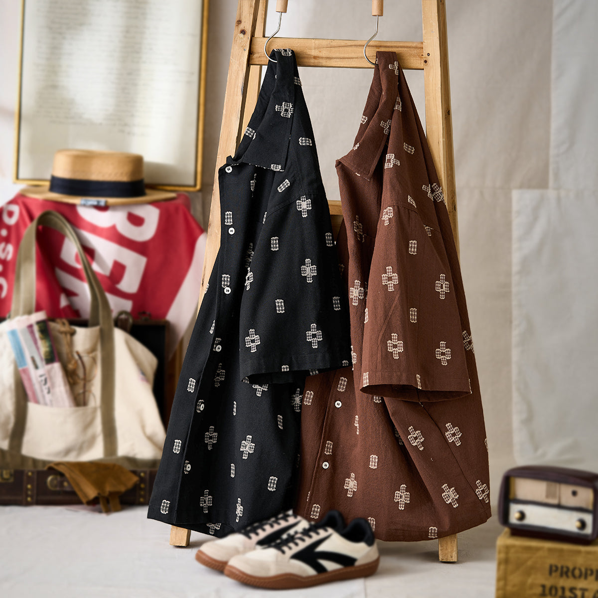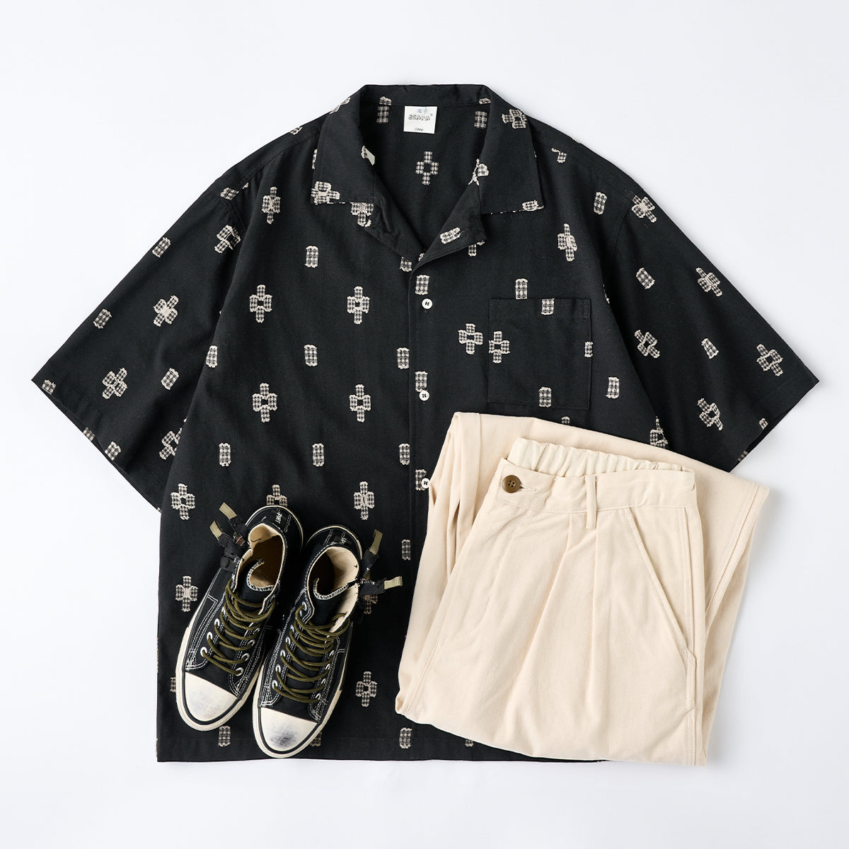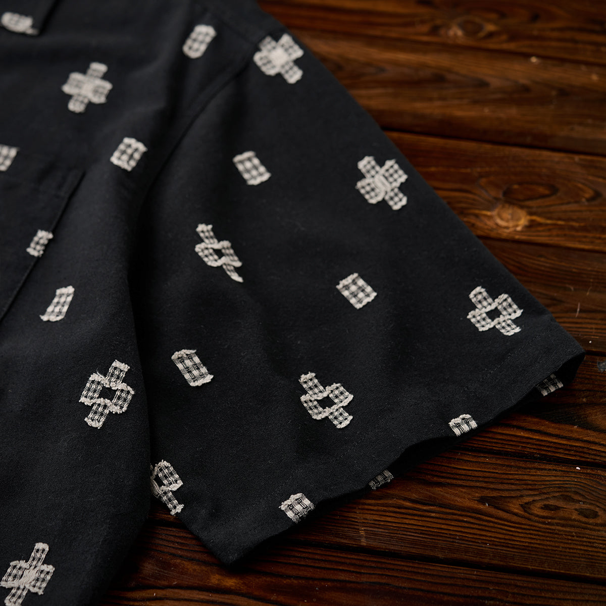 기하학 자수가 리듬감 있게 어우러진 코튼 셔츠로, 내추럴한 감촉과 고급스러운 무드를 동시에 갖춘 아이템. 여유로운 오픈칼라와 박스핏 실루엣이 여름 스타일에 멋스러운 여유를 더해줍니다.