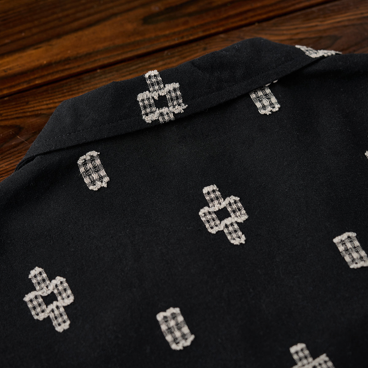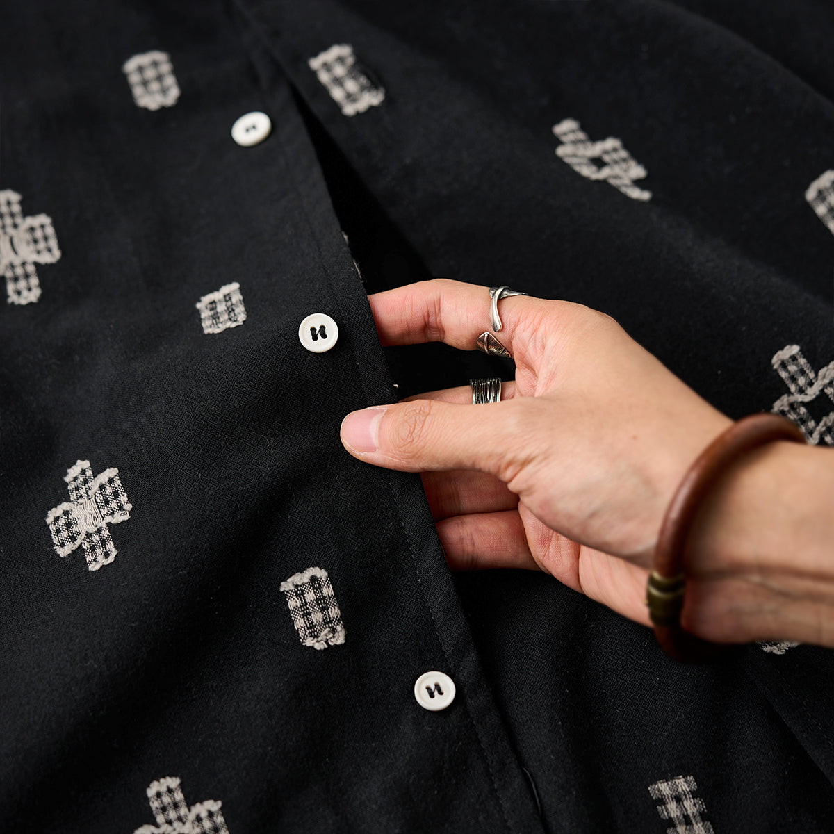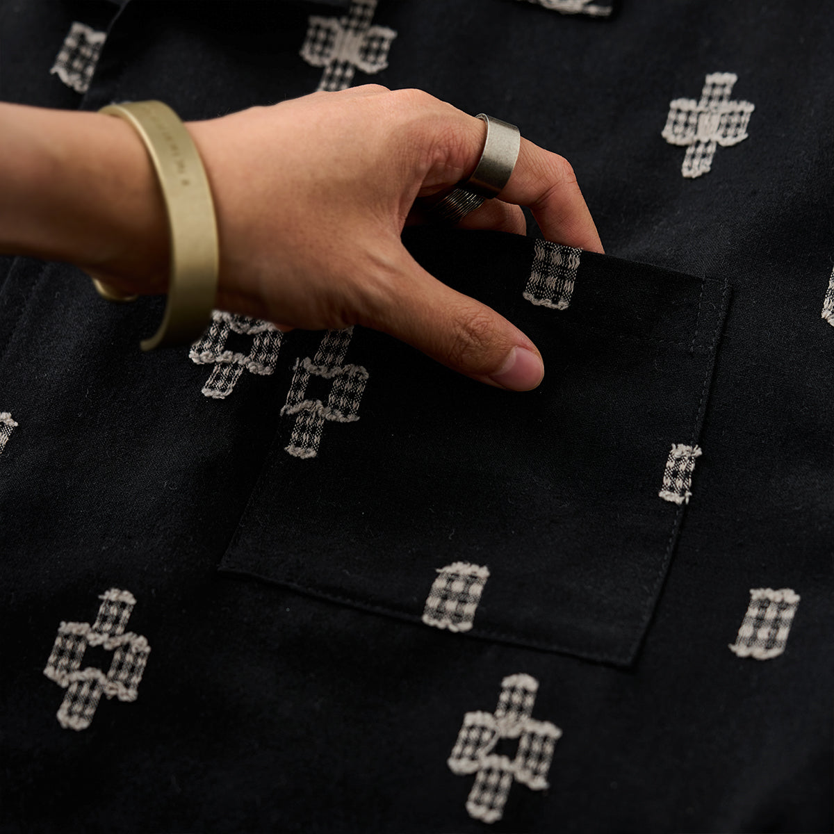 기하학 자수가 리듬감 있게 셔츠 위에 수놓여, 수공예의 고급스러움과 세련된 무드를 동시에 전합니다.