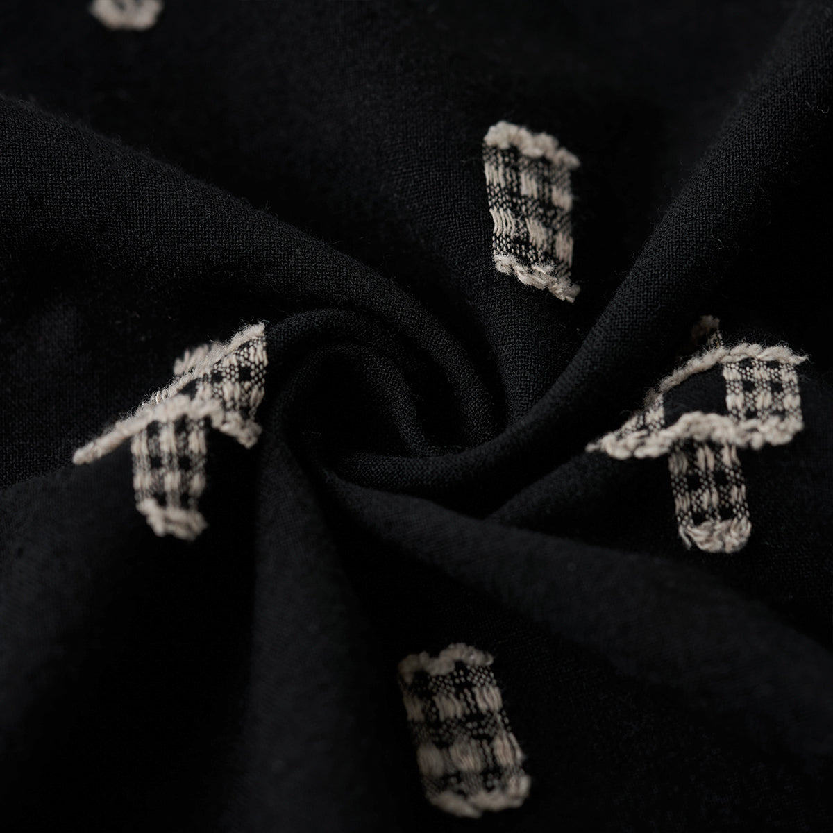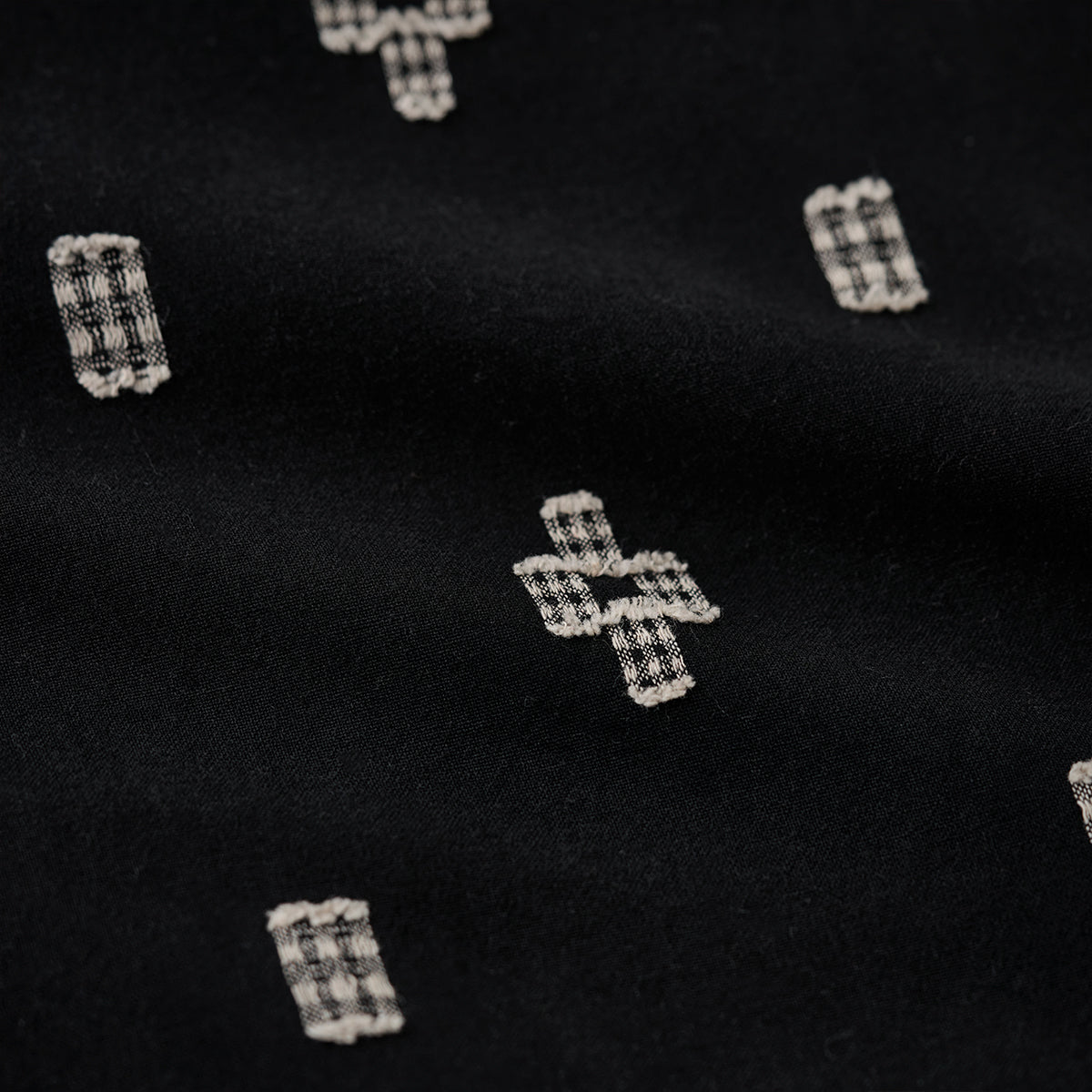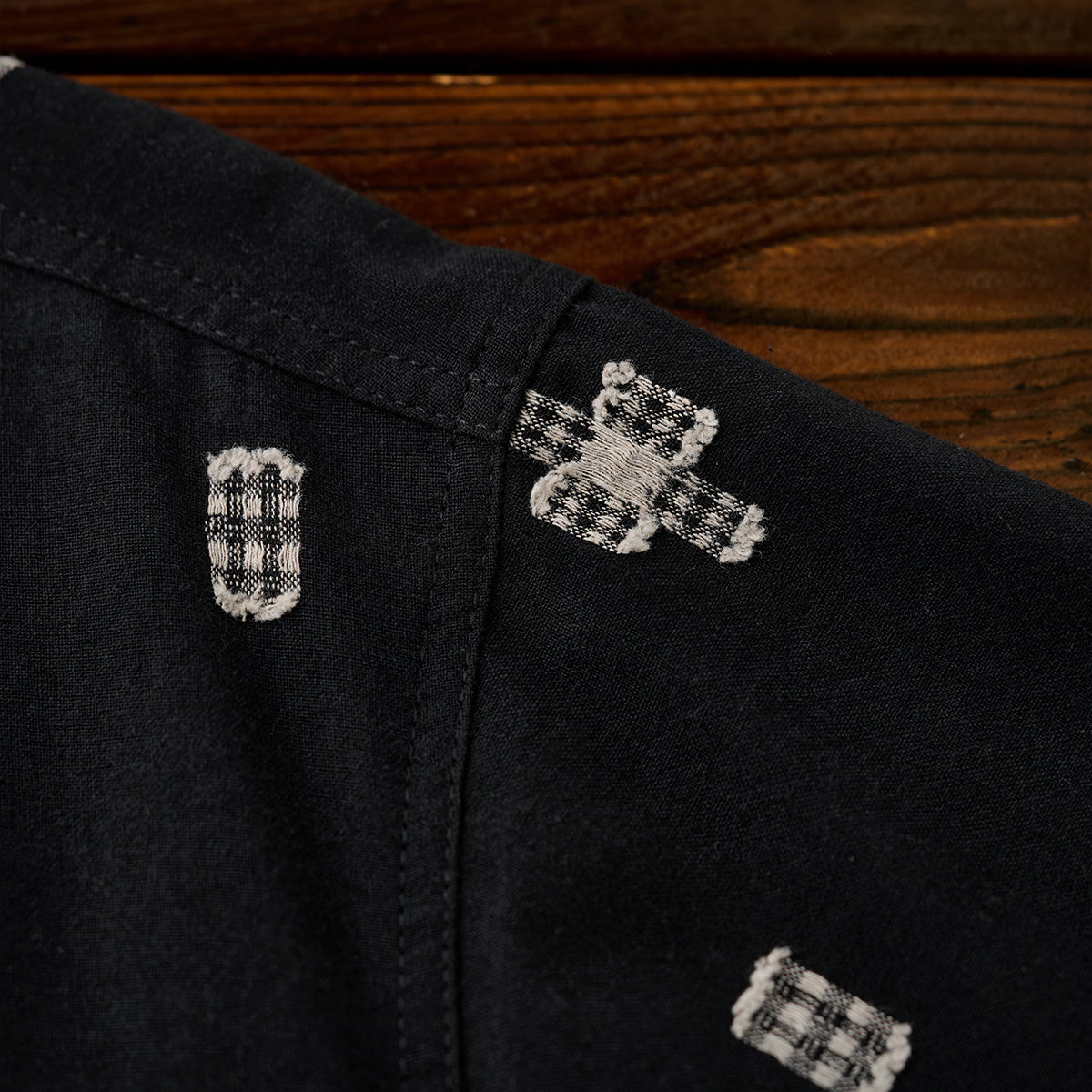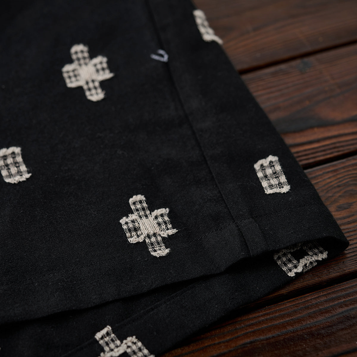 기하학 자수가 리듬감 있게 셔츠 위에 수놓여, 수공예의 고급스러움과 세련된 무드를 동시에 전합니다.
