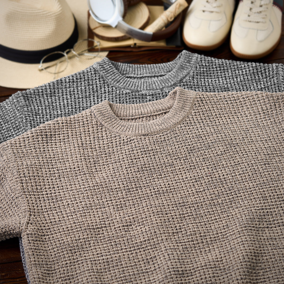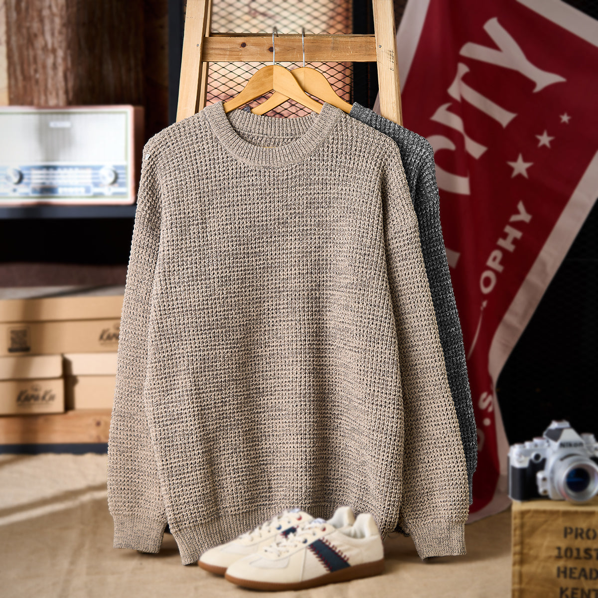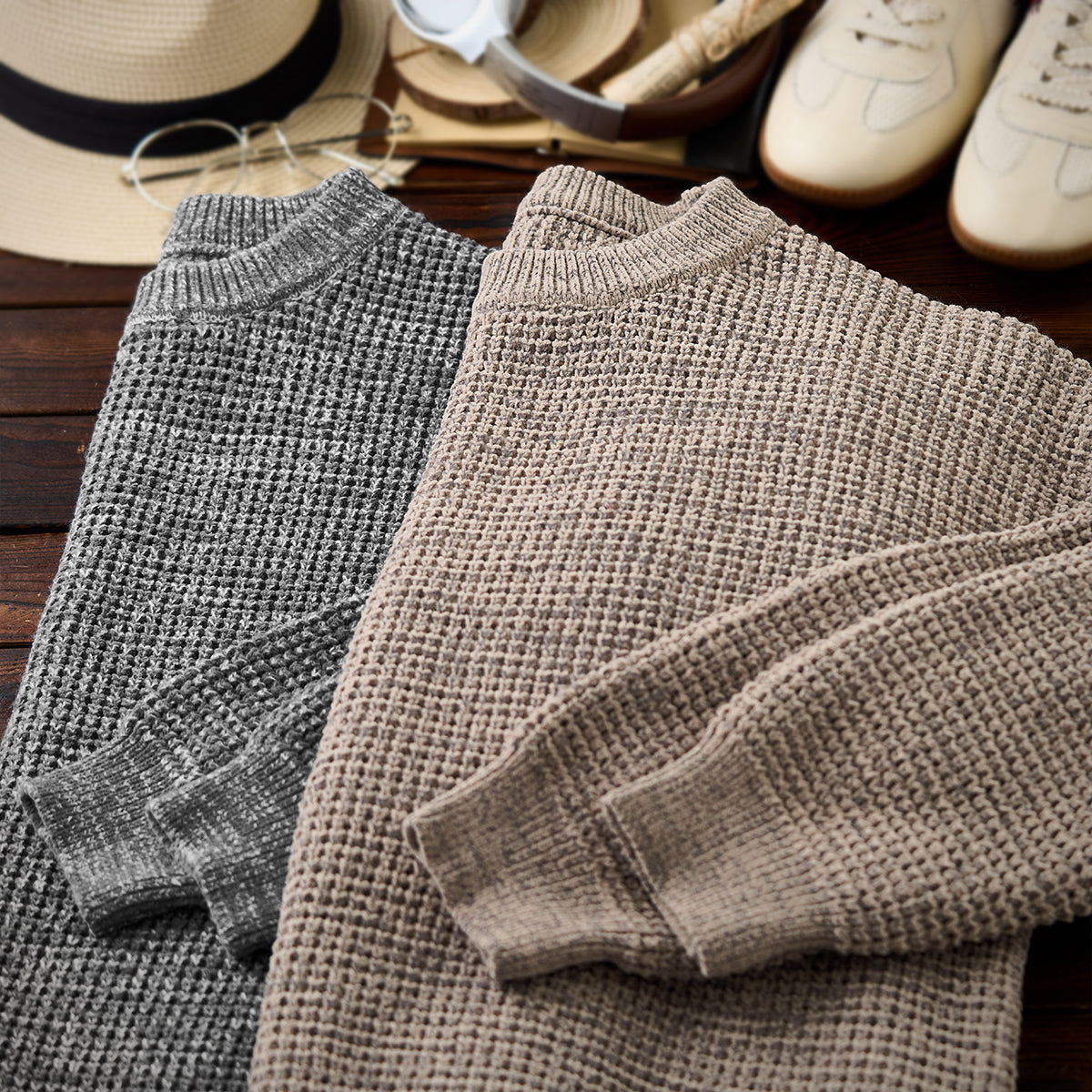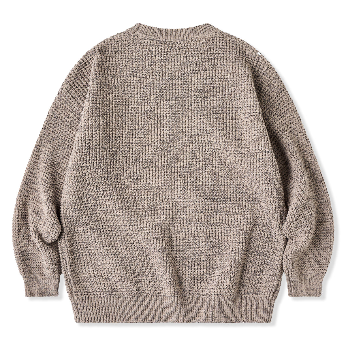 크루넥 디자인과 와플 짜임 구조로 편안하게 착용할 수 있으며, 소매와 밑단의 리브 마감으로 안정적인 핏을 제공하는 스웨터입니다.