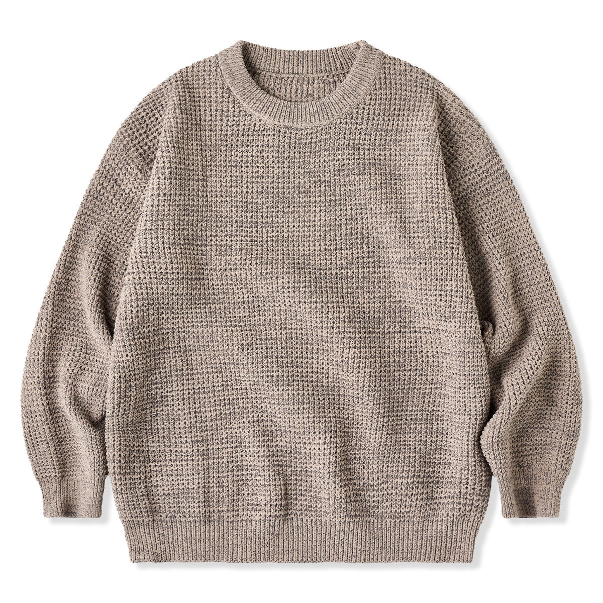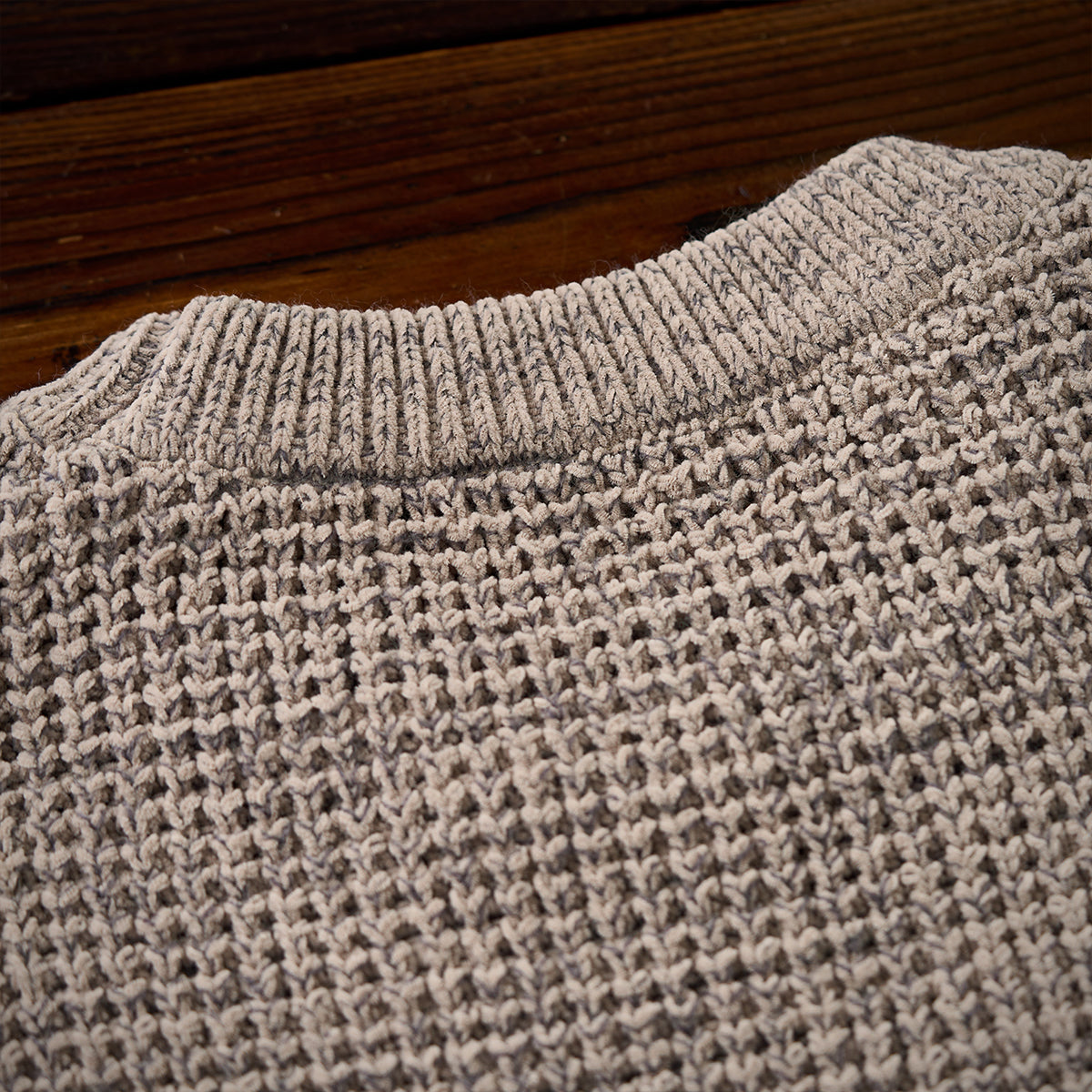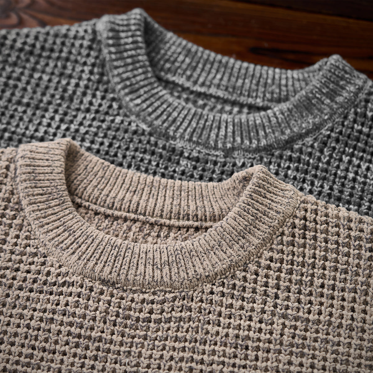 크루넥 디자인과 와플 짜임 구조로 편안하게 착용할 수 있으며, 소매와 밑단의 리브 마감으로 안정적인 핏을 제공하는 스웨터입니다.