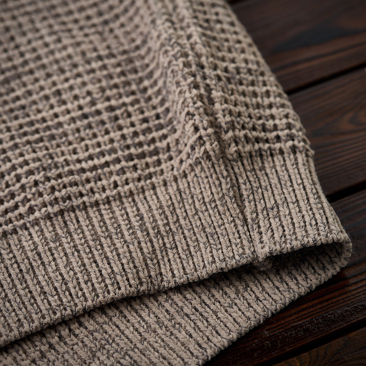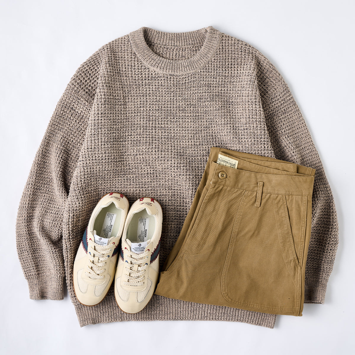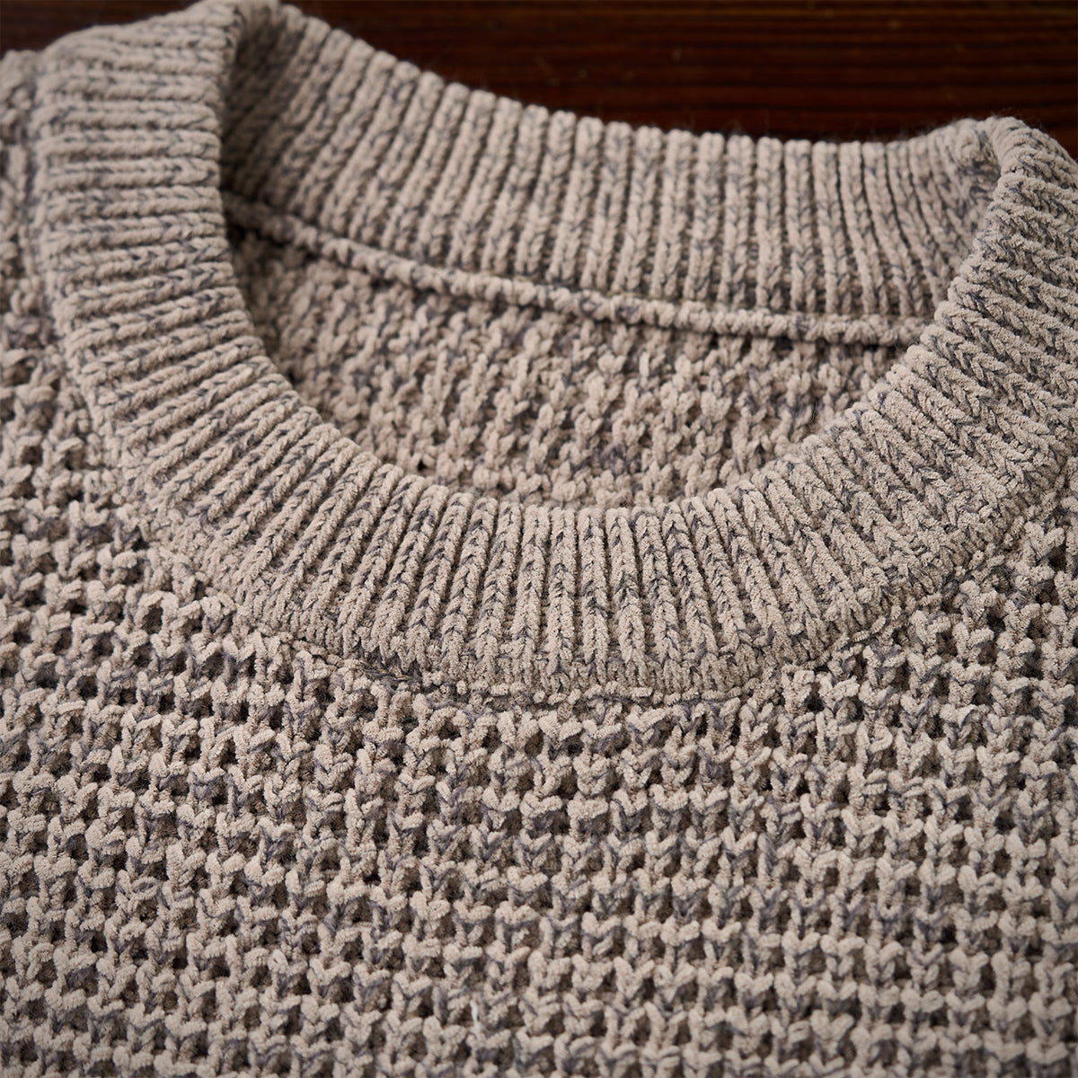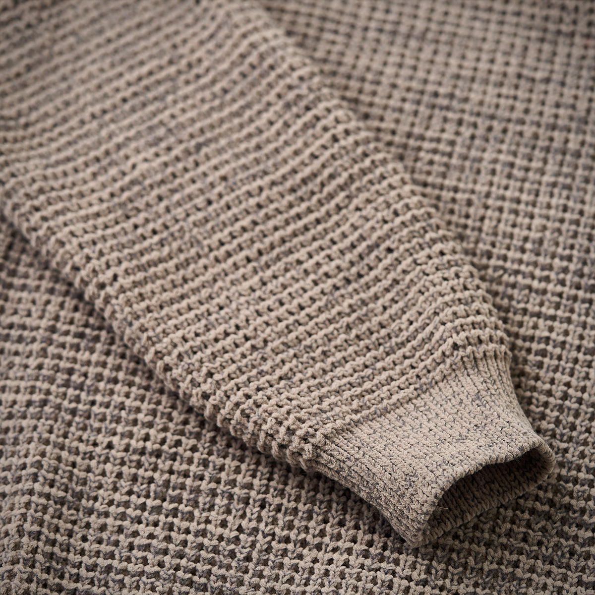 크루넥 디자인과 와플 짜임 구조로 편안하게 착용할 수 있으며, 소매와 밑단의 리브 마감으로 안정적인 핏을 제공하는 스웨터입니다.