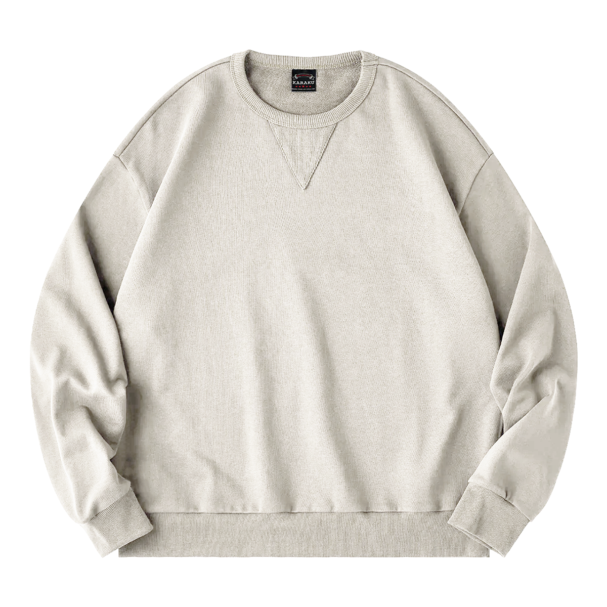 뼈대가 비치는 고양이 일러스트가 다크하면서도 독특한 분위기를 선사하며, 대담한 손글씨풍 ‘KARAKU’ 로고가 스트리트 감성을 더한 스웨트셔츠입니다.