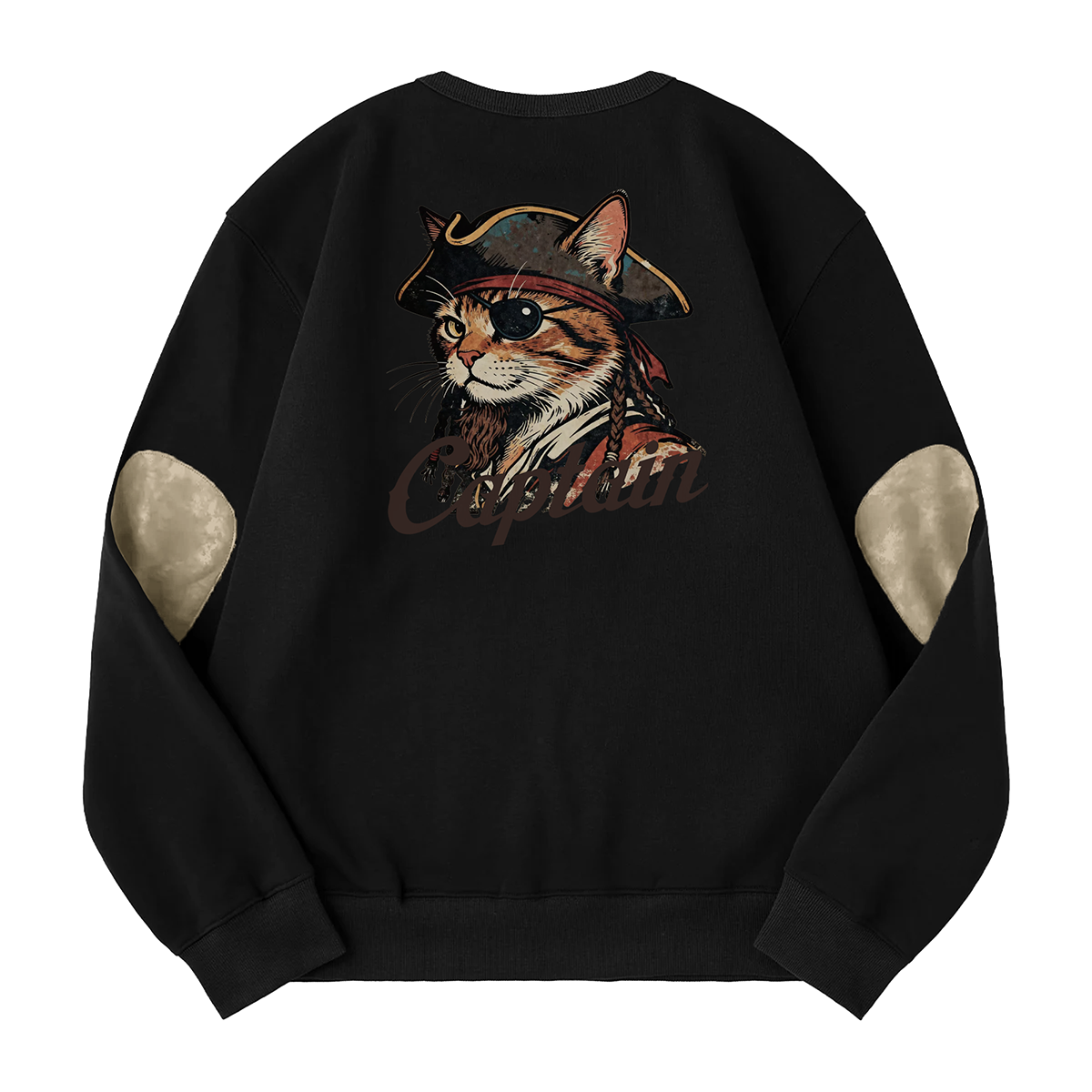 【사전예약】「해적・선장 고양이」프린트 팔꿈치 스웨이드 패치 풀오버 스웨트셔츠