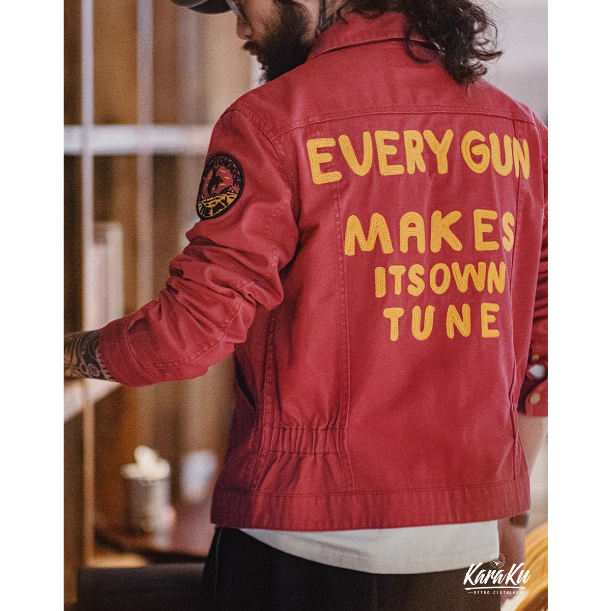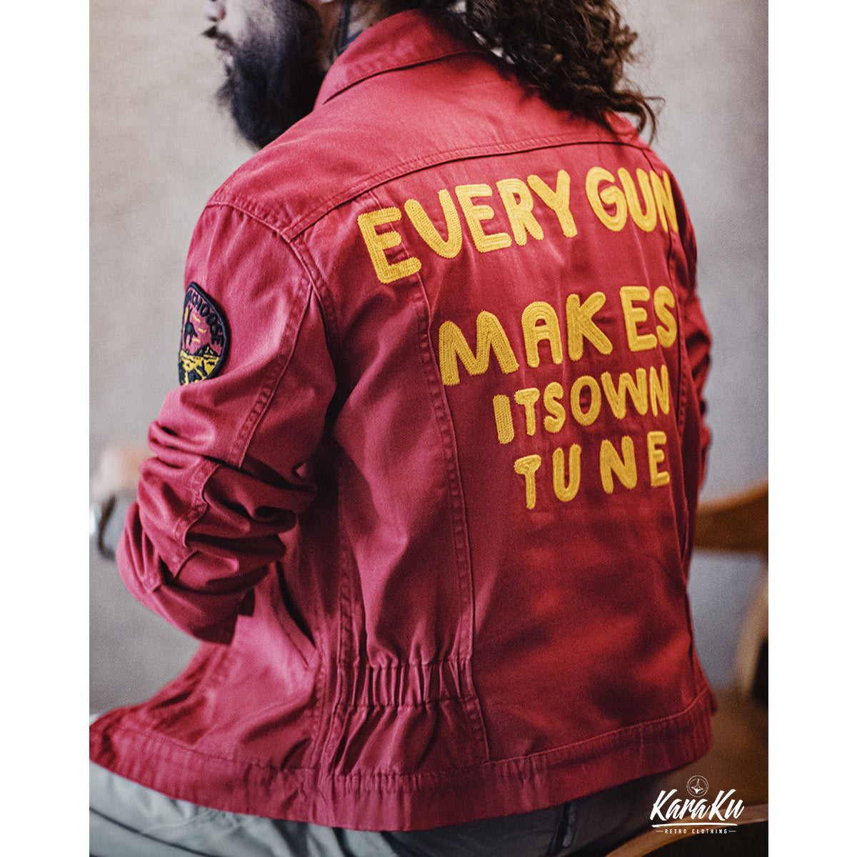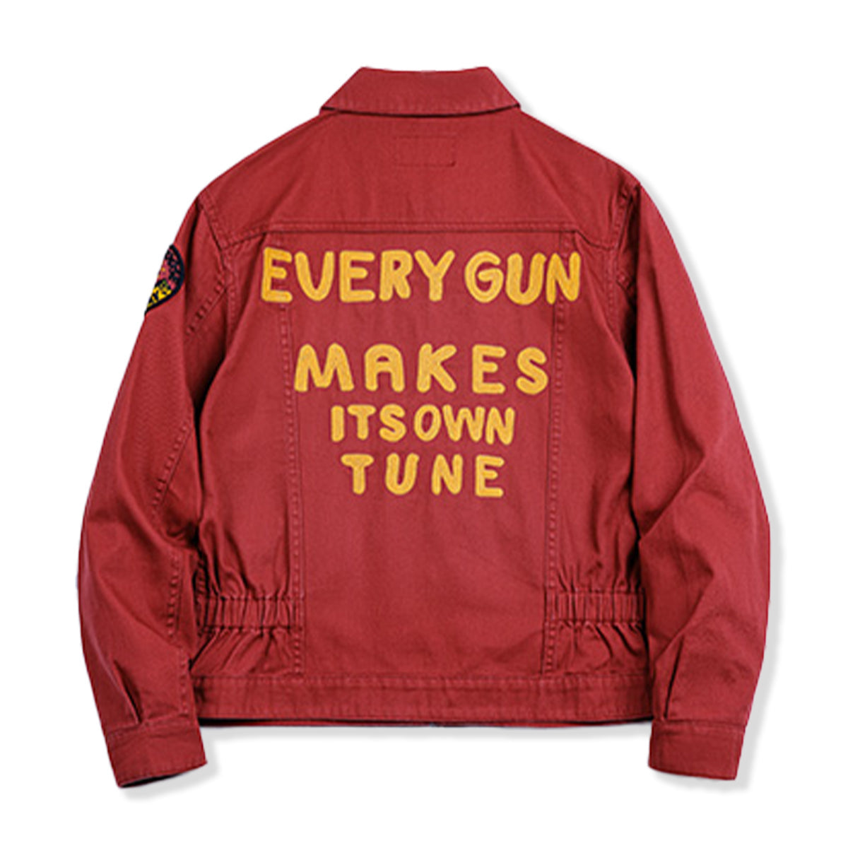 EVERYGUN MAKES ITS OWN TUNE' 자수와 풍차 그래픽이 특징인 헤비 온스 코튼 트윌 소재 자켓으로, 아메카지와 스트리트 스타일에 적합한 아이템입니다.