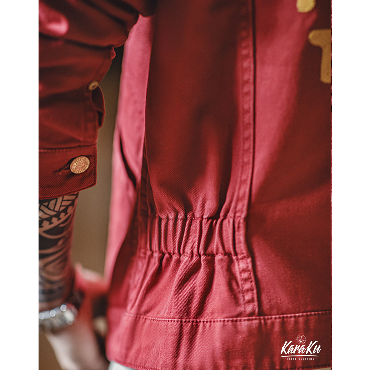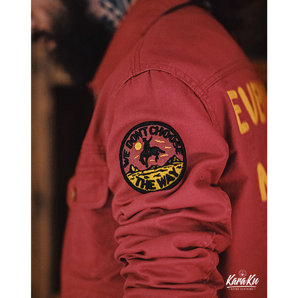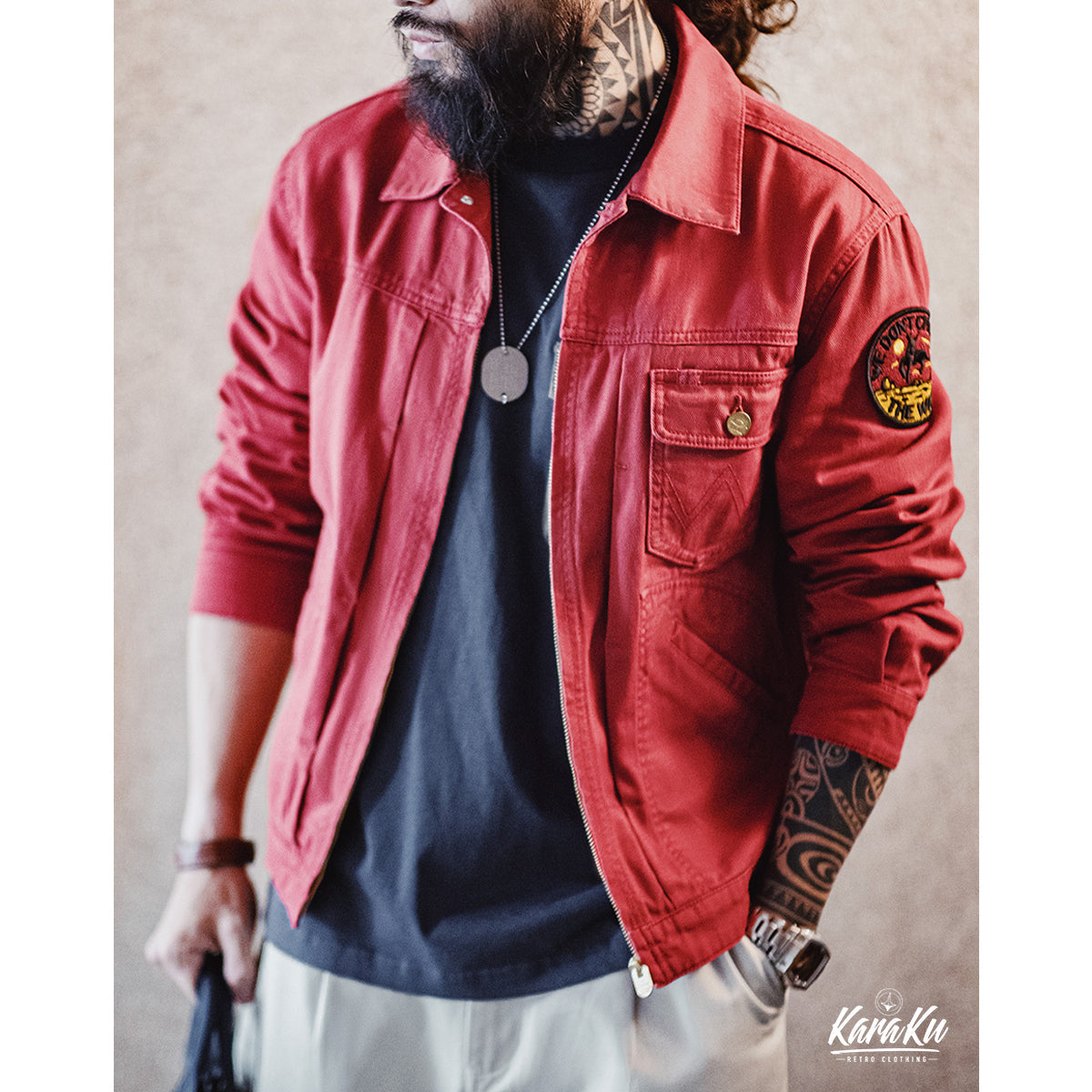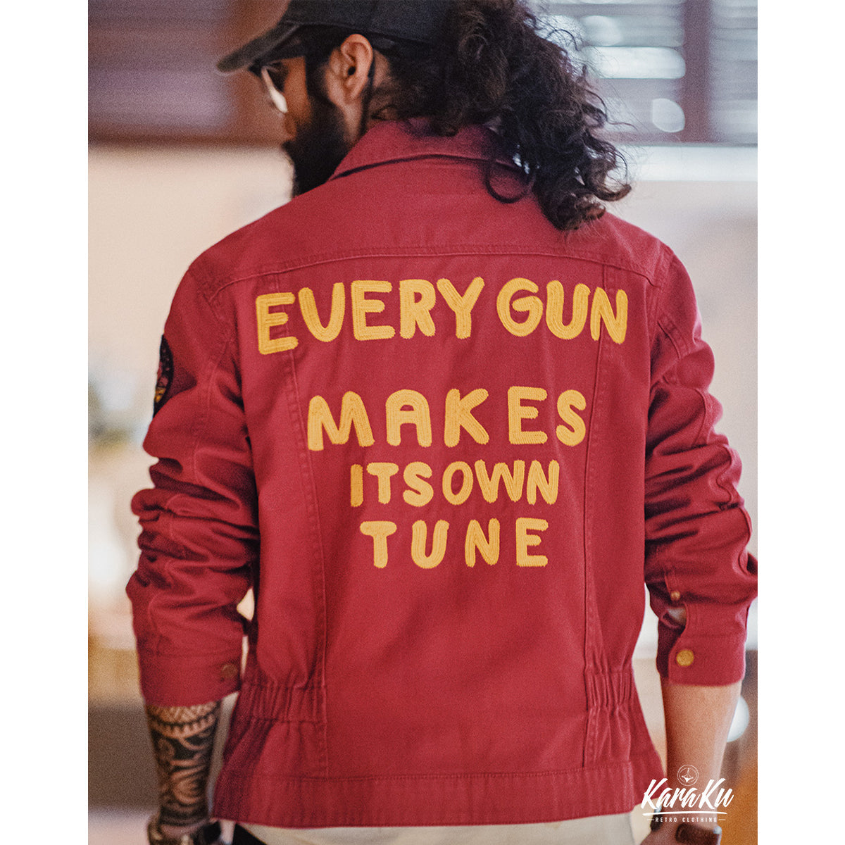 EVERYGUN MAKES ITS OWN TUNE' 자수와 풍차 그래픽이 특징인 헤비 온스 코튼 트윌 소재 자켓으로, 아메카지와 스트리트 스타일에 적합한 아이템입니다.