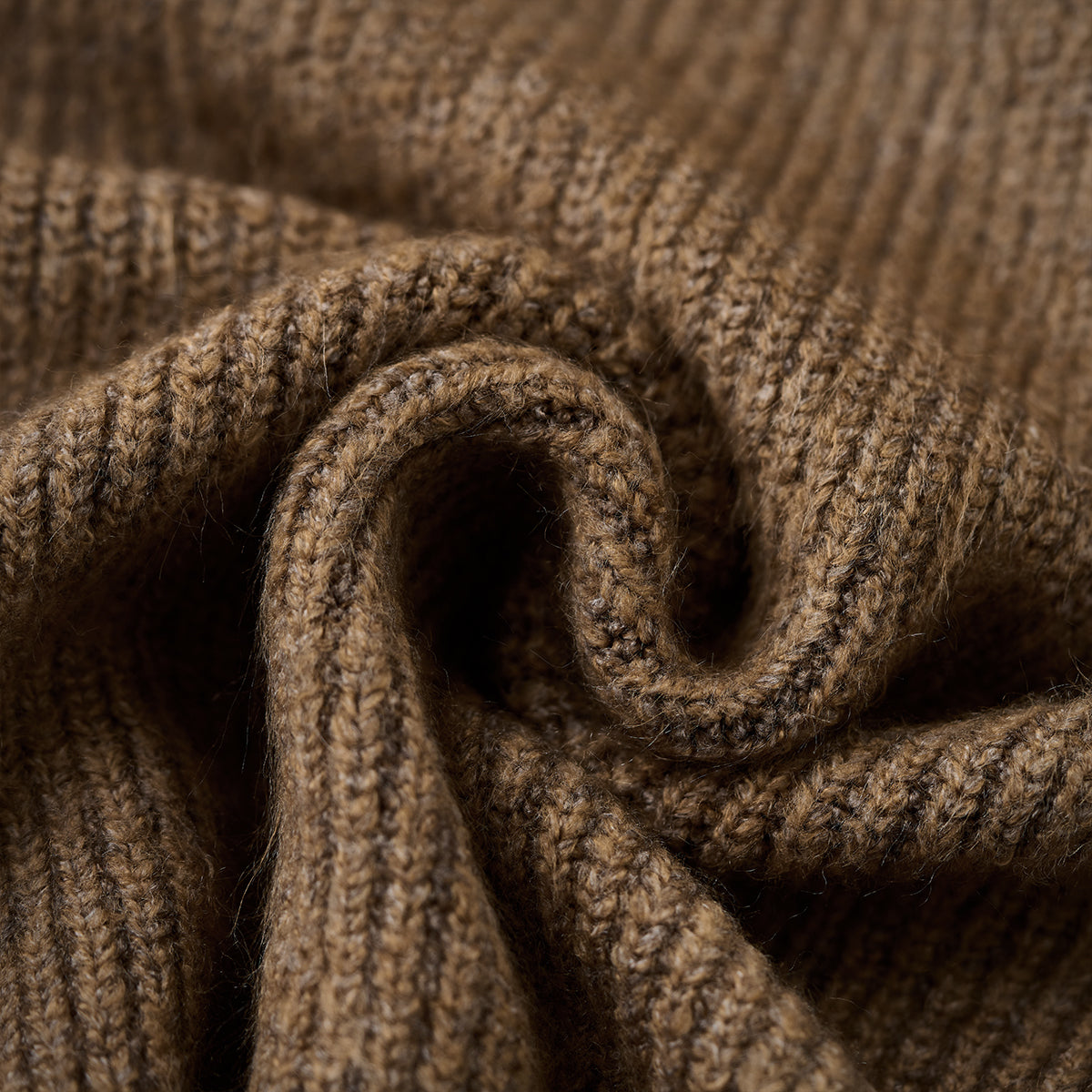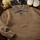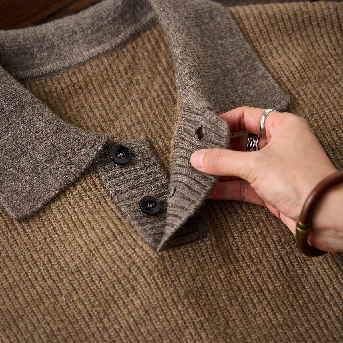 캐주얼한 폴로 칼라와 우드 톤 버튼이 자연스러운 분위기를 살린 니트로, 리브 처리된 소매와 밑단이 편안한 착용감과 보온성을 제공합니다.