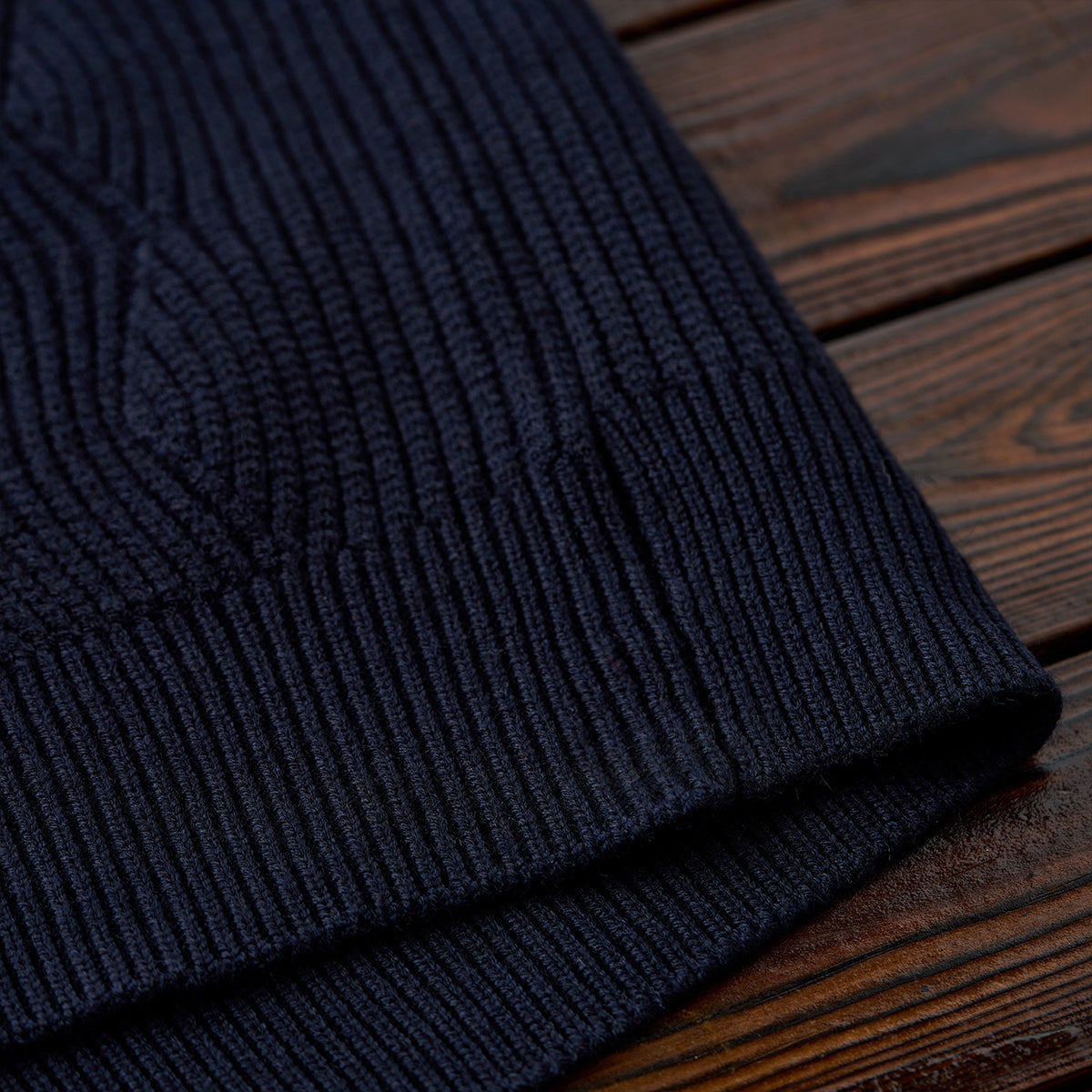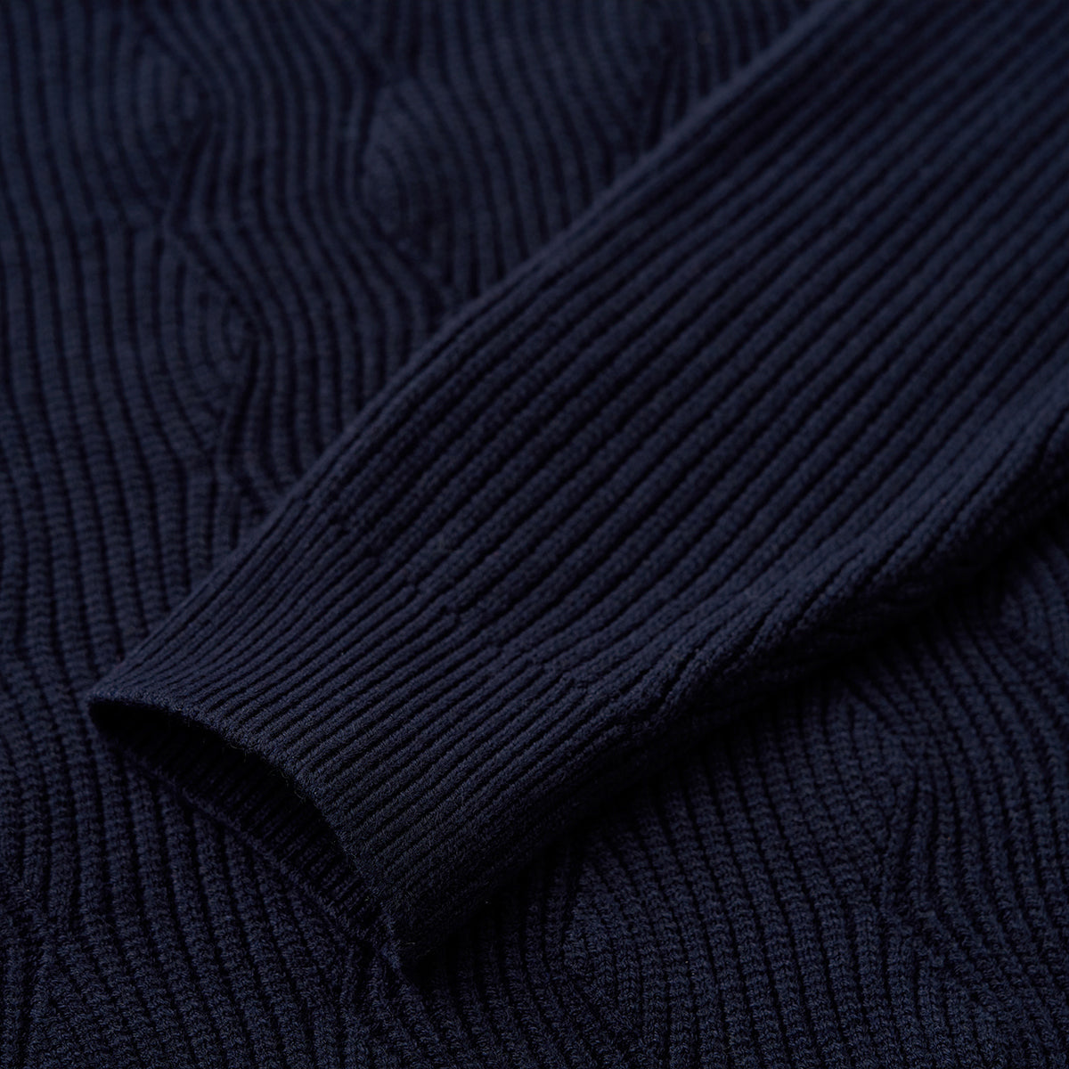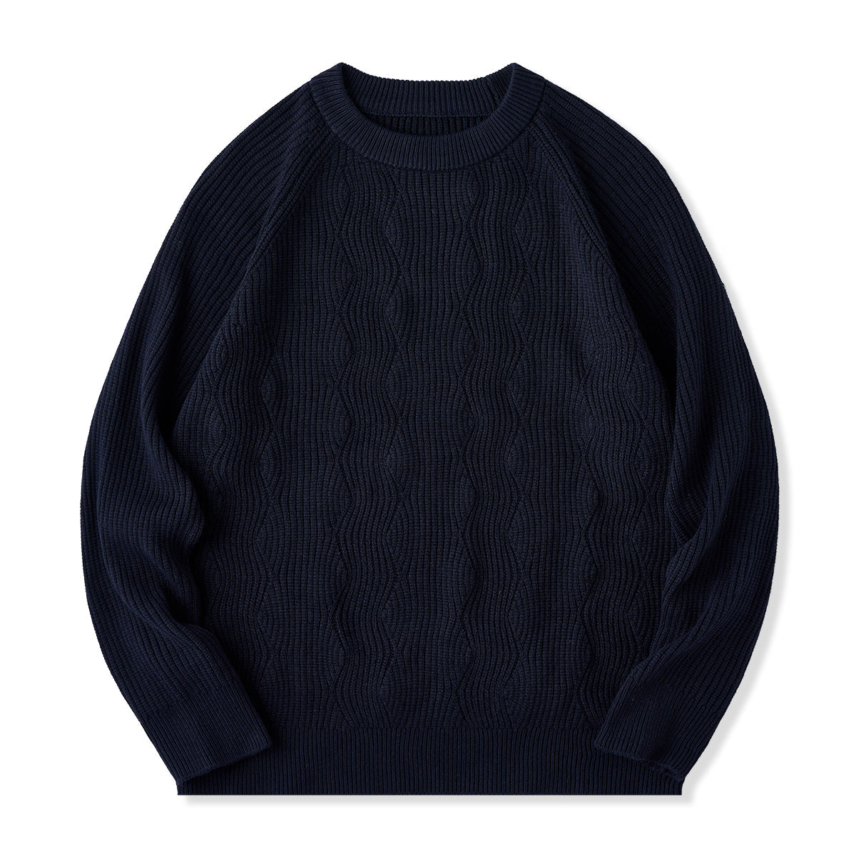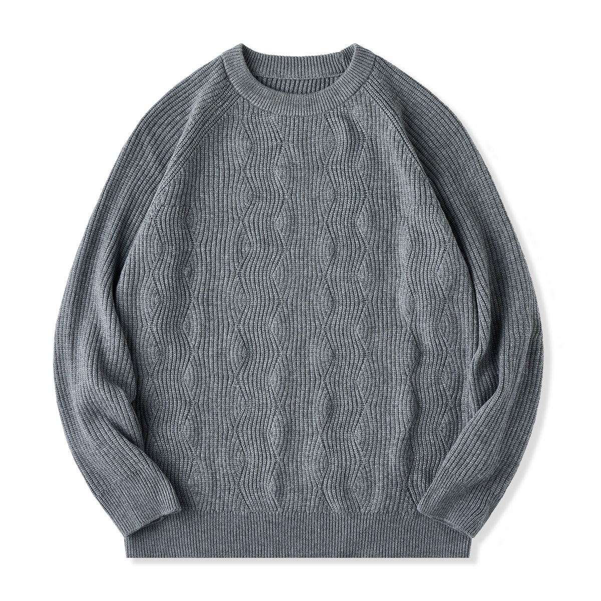 스웨터 중앙의 세로 파도 패턴이 심플하면서도 입체감과 움직임이 느껴지는 실루엣을 연출합니다.