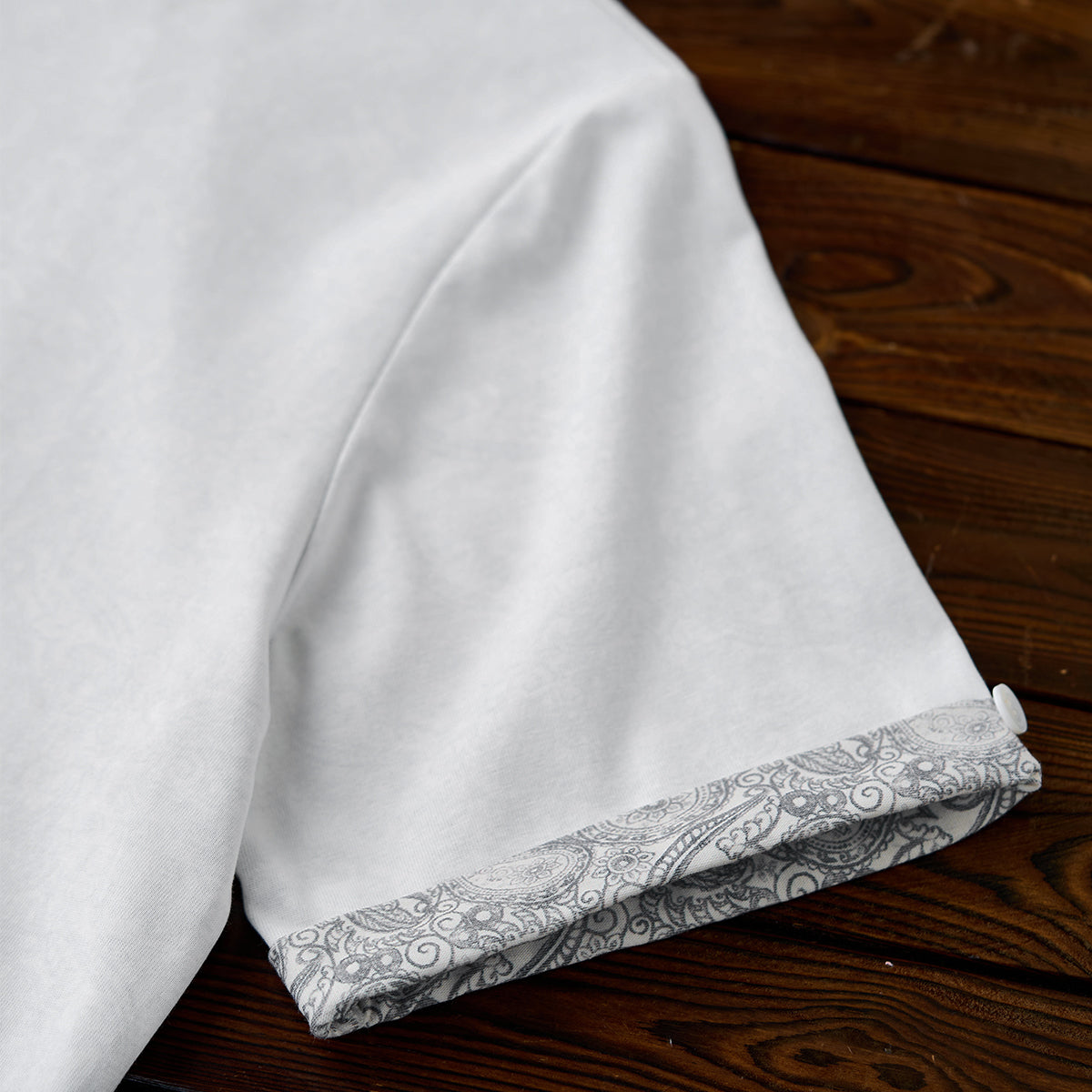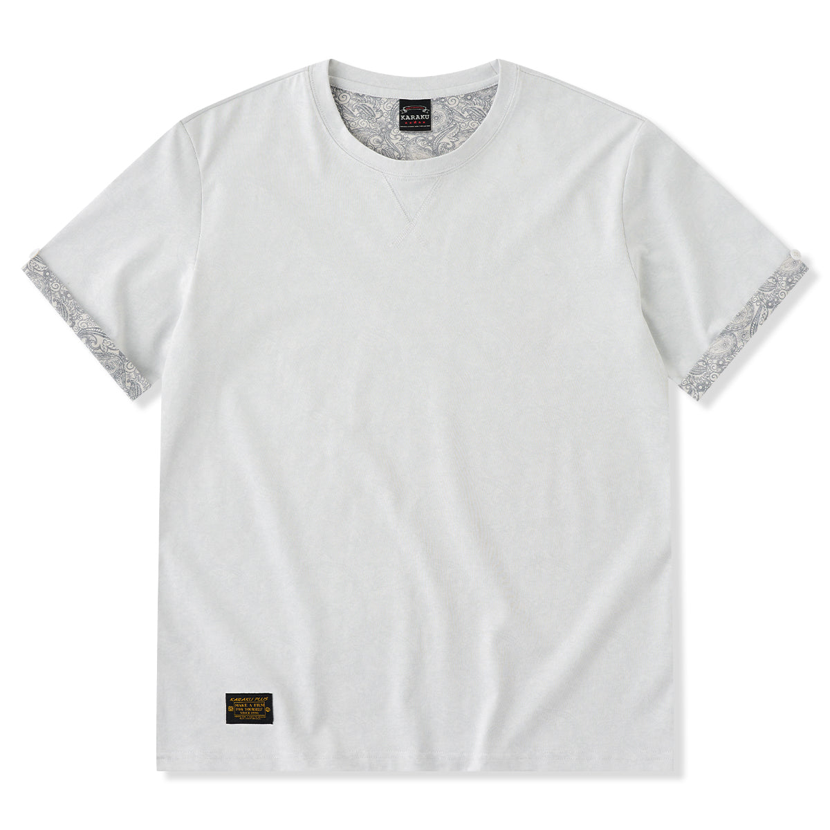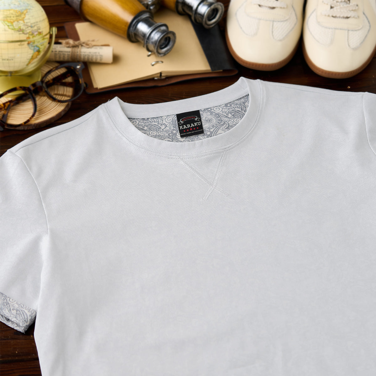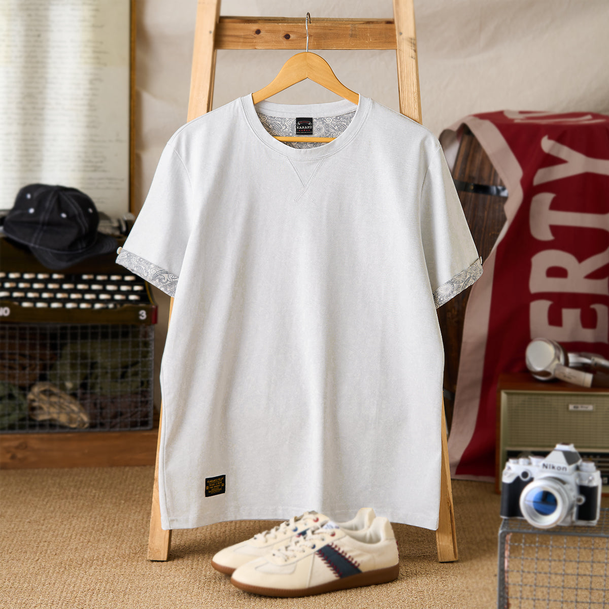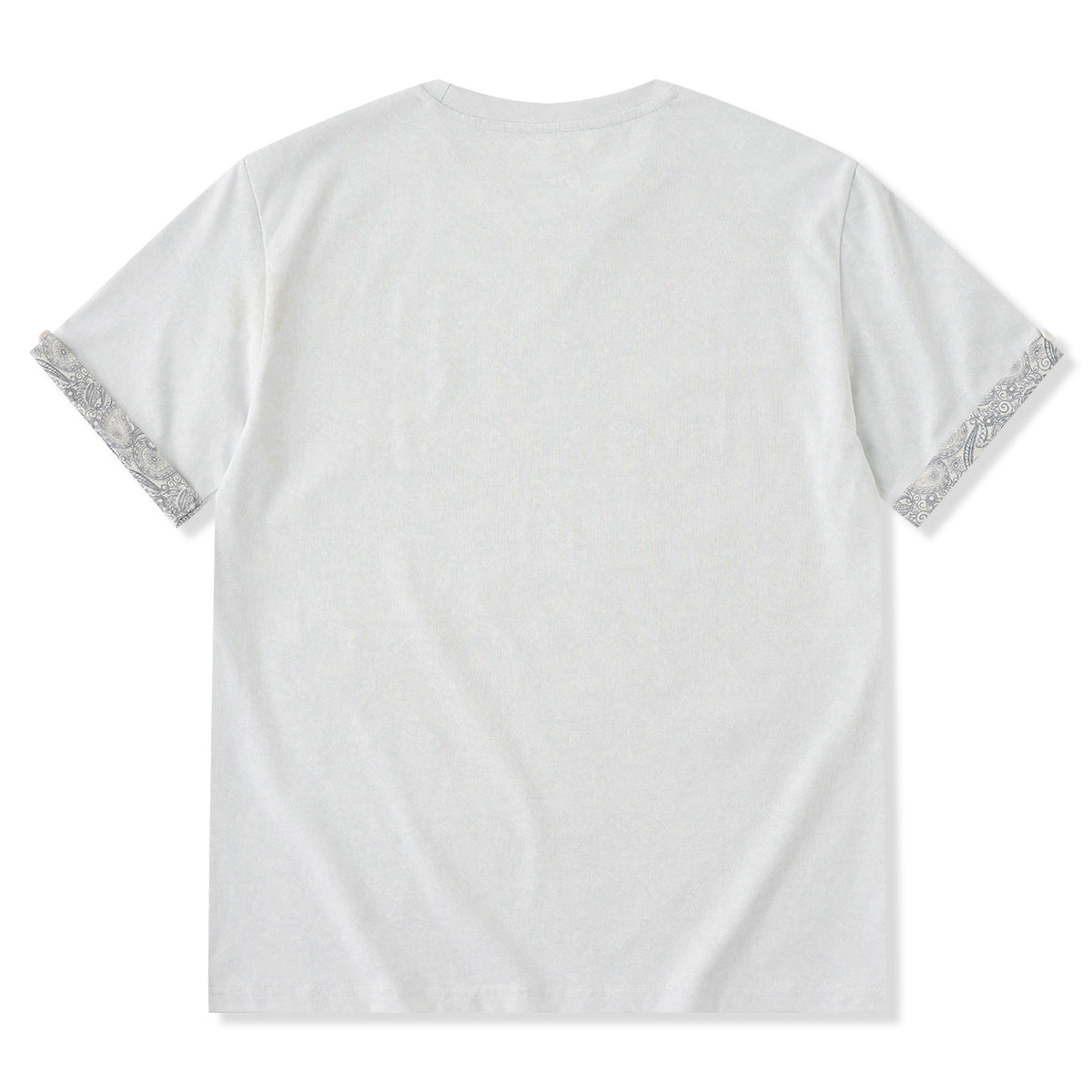 미니멀한 무지 디자인에 안쪽 페이즐리 패턴을 더해 은은한 포인트와 깊이감을 살린 반팔 티셔츠입니다. V거셋 디테일과 탄탄한 원단으로 실루엣을 잡아줍니다.